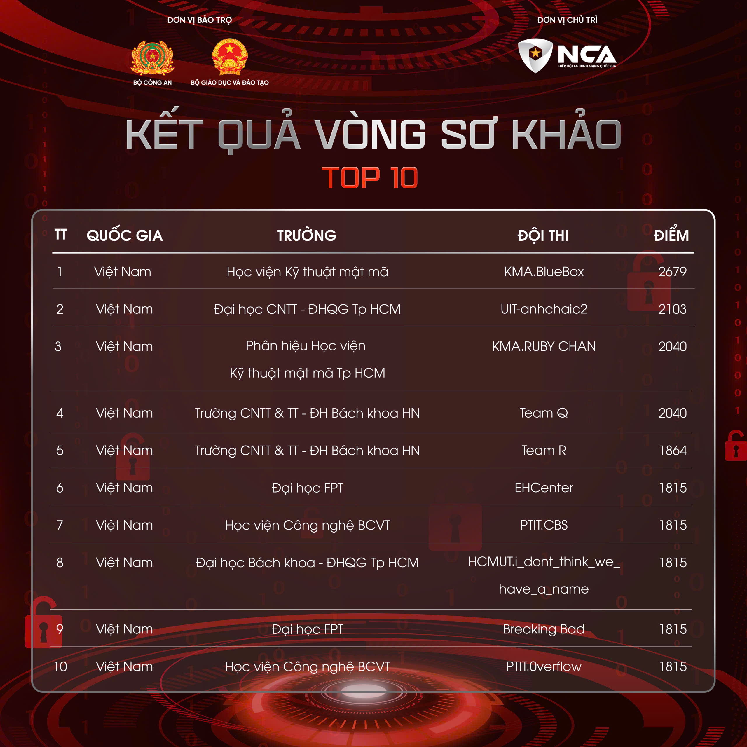 Đội BlueBox (Học viện Kỹ thuật Mật mã) đứng đầu bảng với 18/21 thử thách, đạt 2.679 điểm; theo sau là Anhchaic2 (ĐH Công nghệ Thông tin - ĐHQG TP.HCM) với 2.103 điểm, và RUBY CHAN (Phân hiệu Học viện Kỹ thuật Mật mã TP.HCM) với 2.040 điểm. Hai đội Team Q và Team R của Trường CNTT&TT - ĐH Bách khoa Hà Nội lần lượt xếp thứ 4 và 5. Sáu đội còn lại trong Top 10 đều đạt 1.815 điểm, được xếp hạng dựa trên thời gian nộp lời giải sớm hơn - thể hiện sự cạnh tranh gay gắt và trình độ đồng đều.