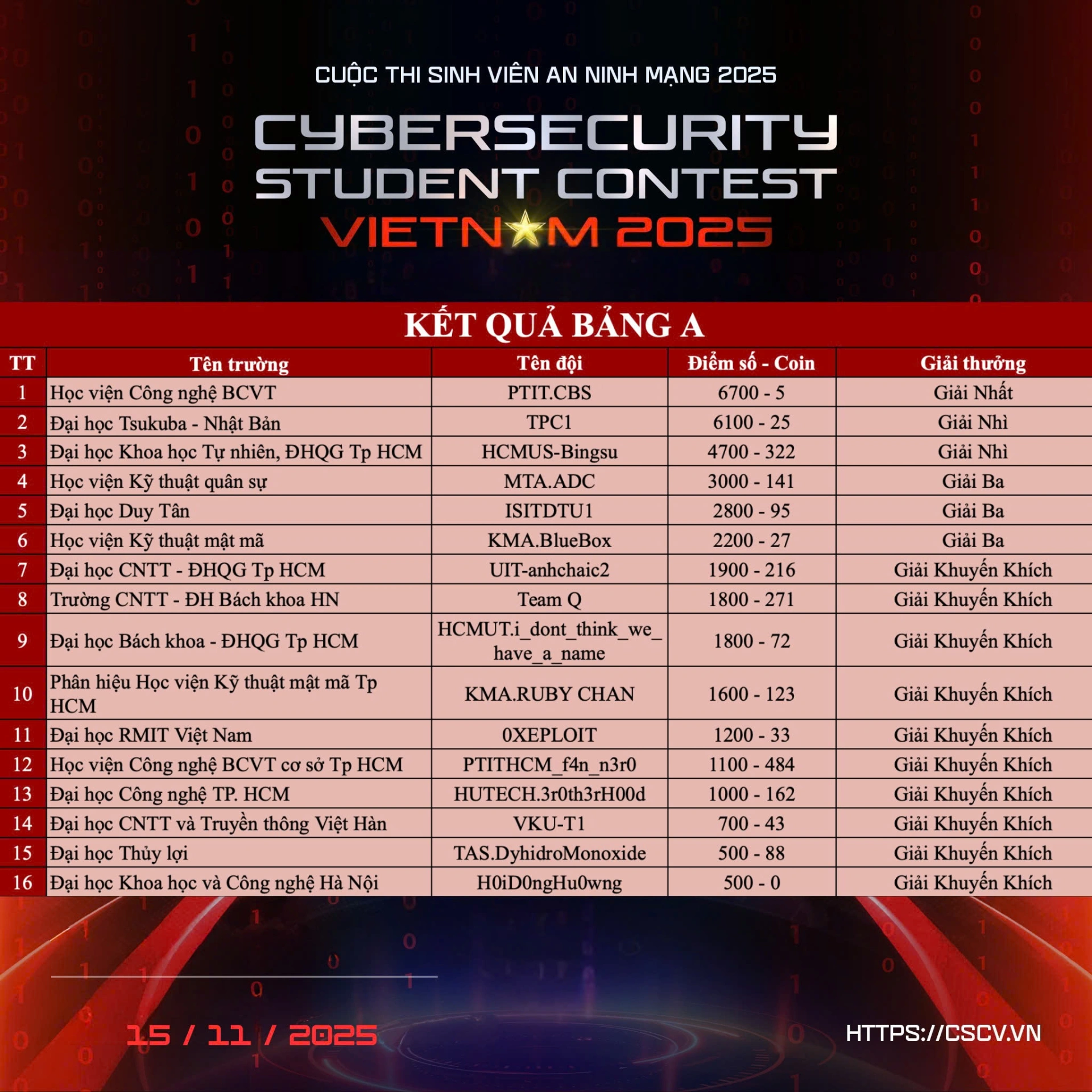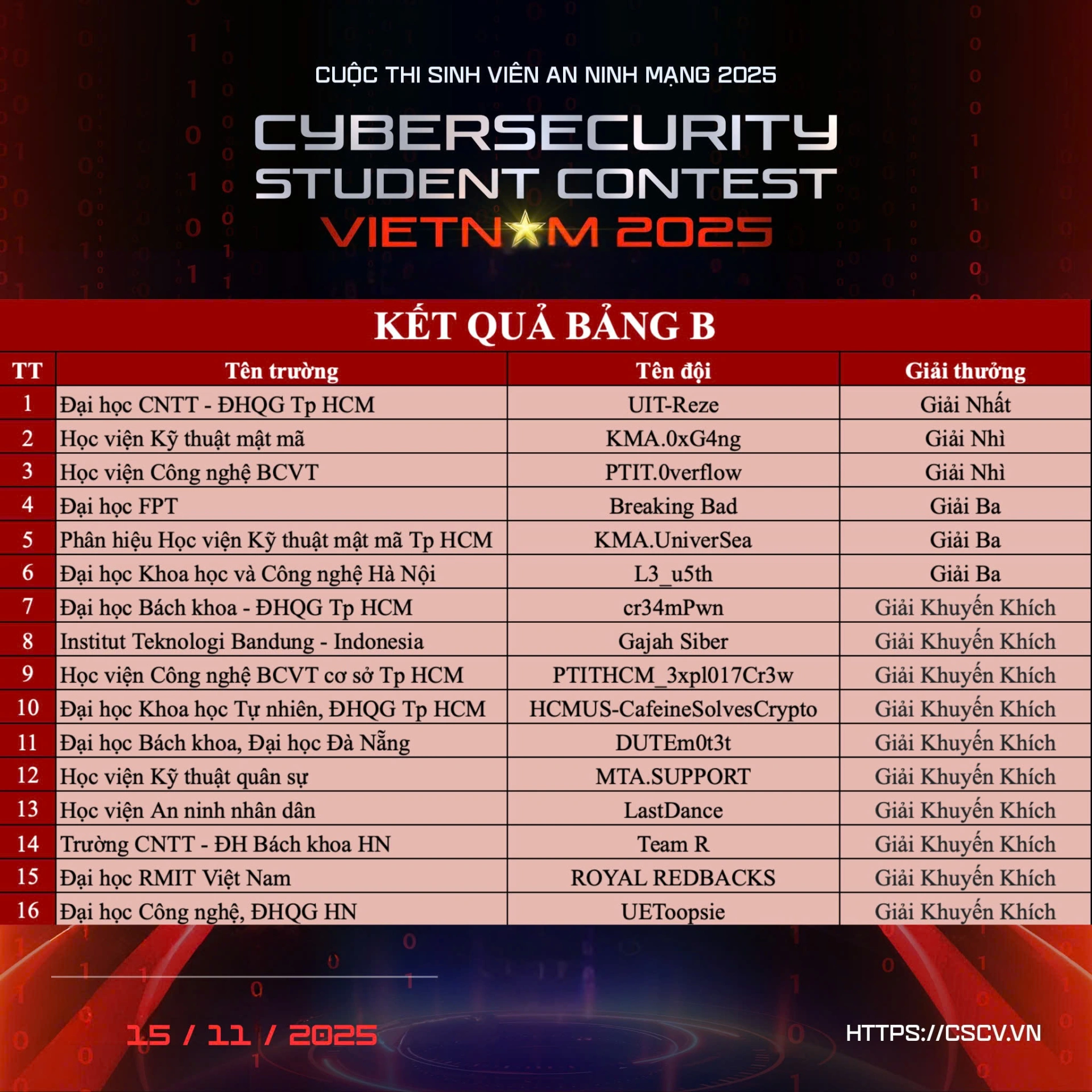Tối 15/11, Hiệp hội An ninh mạng quốc gia (NCA) phối hợp cùng Cục An ninh mạng và phòng, chống tội phạm sử dụng công nghệ cao - A05 (Bộ Công an) đã tổng kết sau một ngày tranh tài căng thẳng, quyết liệt nhưng cũng vô cùng hào hứng và đầy trí tuệ, kết quả chung cuộc của “Sinh viên An ninh mạng 2025” ở cả 2 bảng A và B đã được công bố.