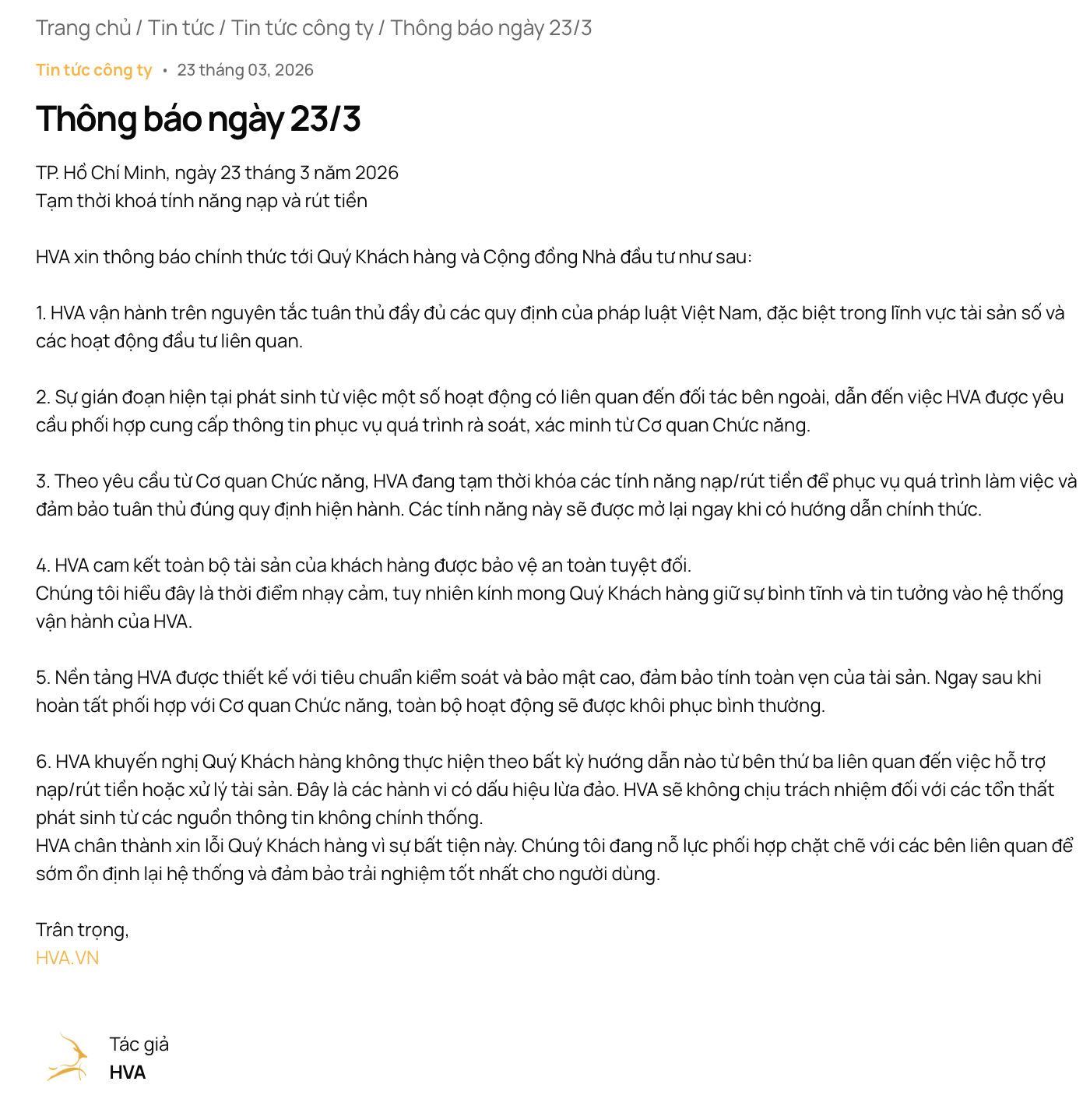 Doanh nghiệp này cam kết toàn bộ tài sản của khách hàng được bảo vệ an toàn tuyệt đối. "Chúng tôi hiểu đây là thời điểm nhạy cảm, tuy nhiên kính mong Quý Khách hàng giữ sự bình tĩnh và tin tưởng vào hệ thống vận hành của HVA", thông báo nêu.