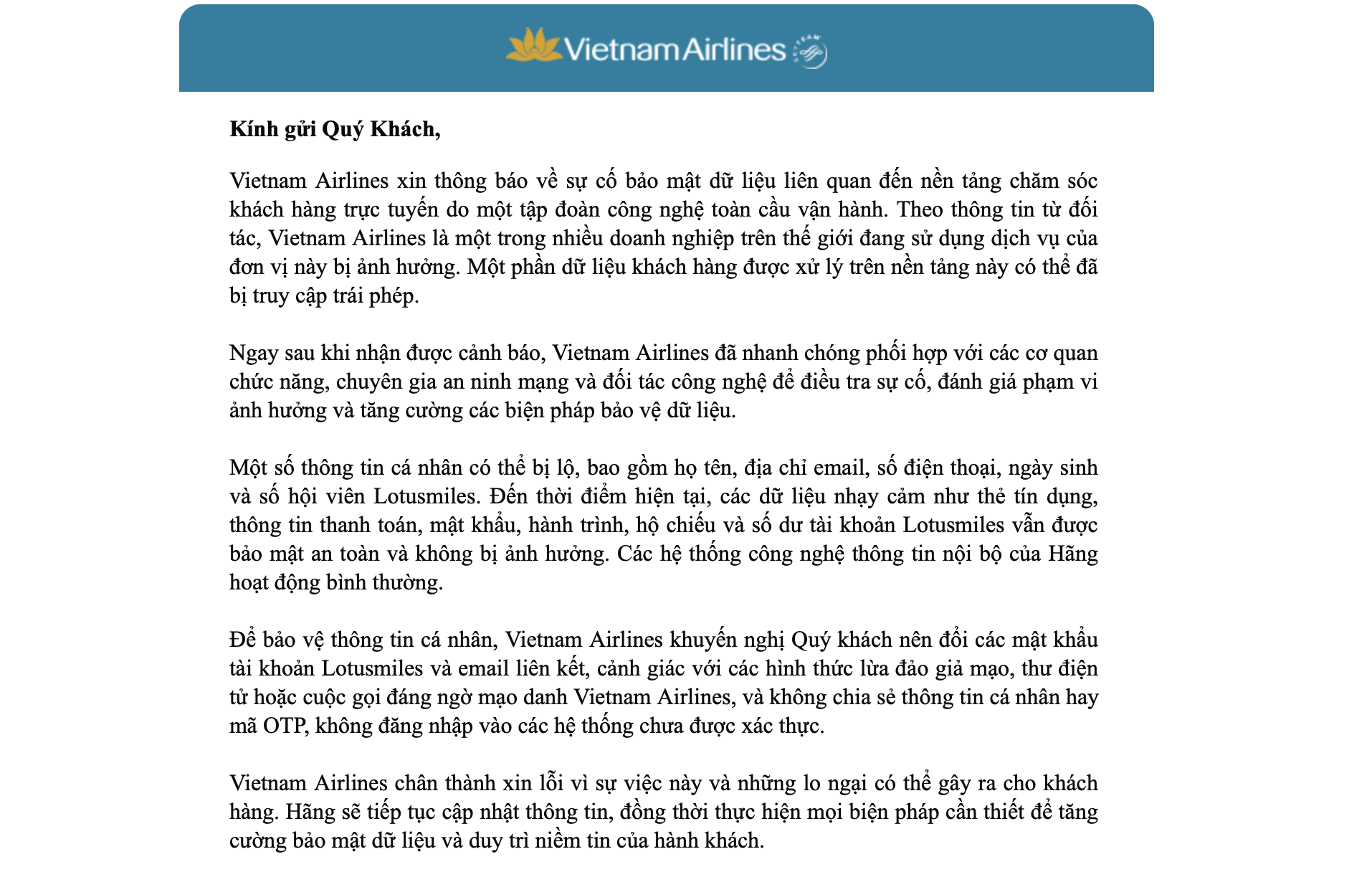 "Vietnam Airlines chân thành xin lỗi vì sự việc này và những lo ngại có thể gây ra cho khách hàng. Hãng sẽ tiếp tục cập nhật thông tin, đồng thời thực hiện mọi biện pháp cần thiết để tăng cường bảo mật dữ liệu và duy trì niềm tin của hành khách", thông báo của hãng hàng không nêu.