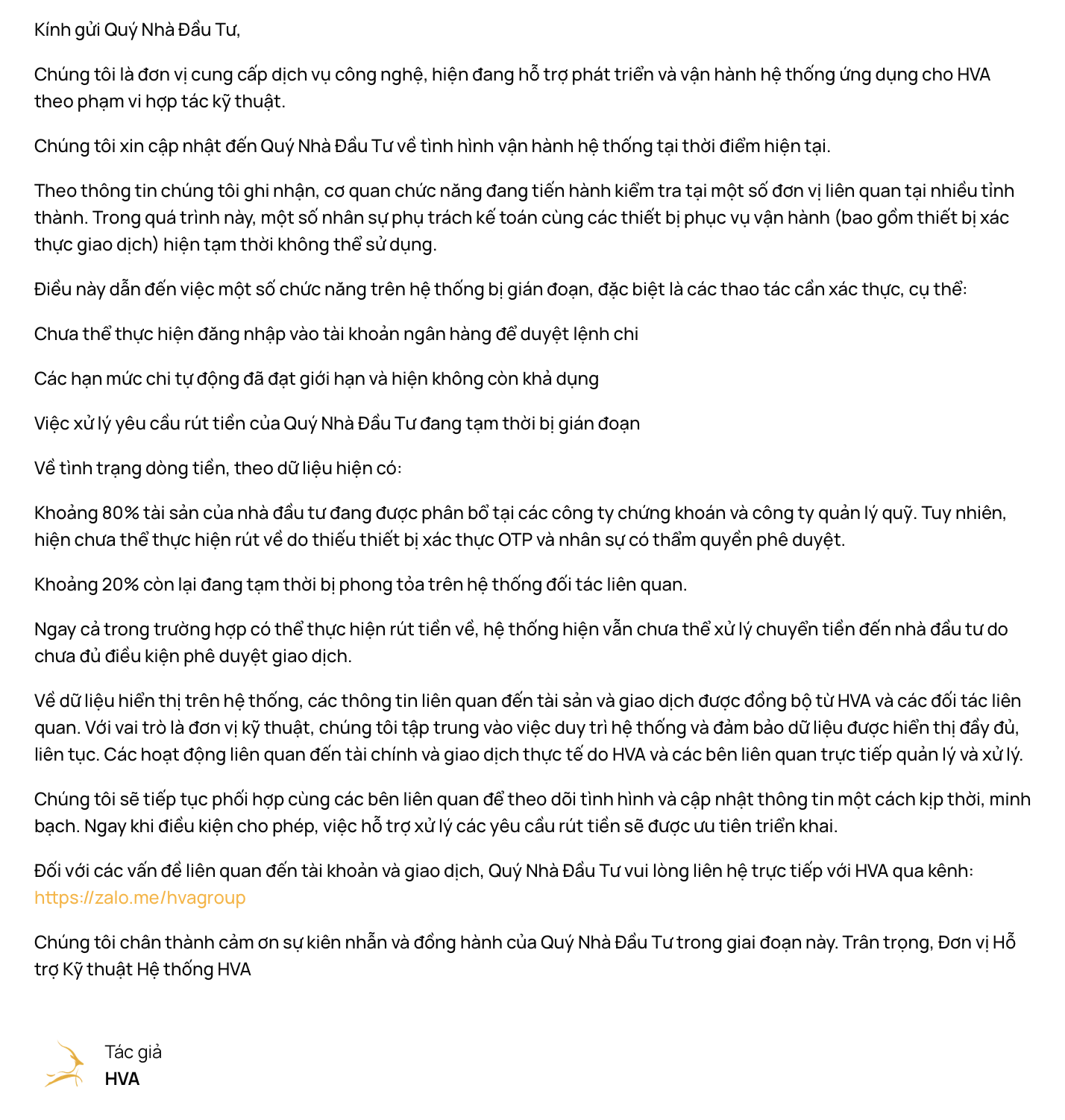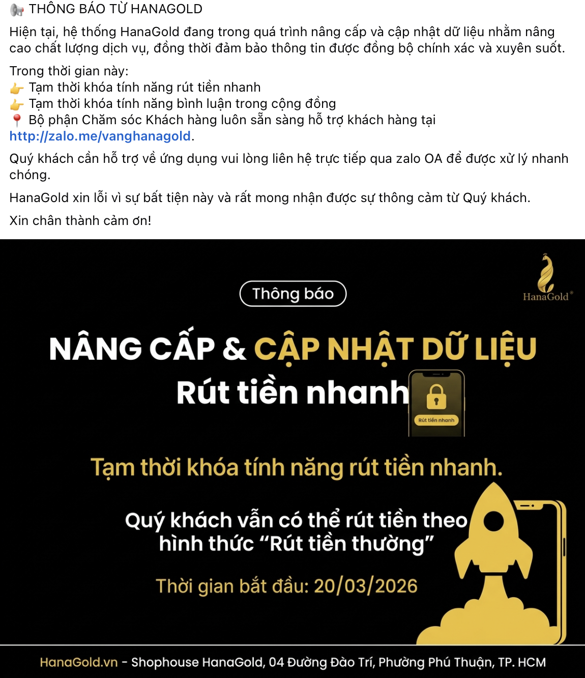 Cũng trong ngày 20/3, Hanagold một ứng dụng mua vàng online do HVA đầu tư cũng thông báo tạm thời khoá rút tiền nhanh và khoá chat cộng đồng.