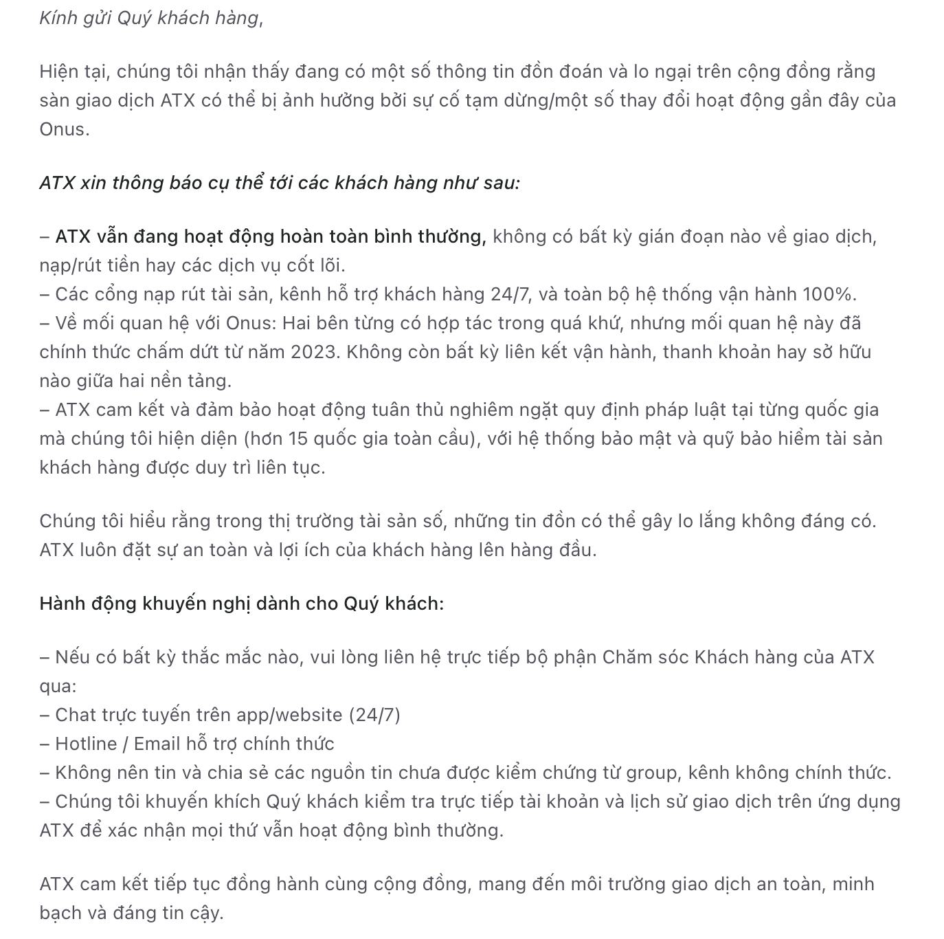 ATX cũng nhấn mạnh đang duy trì các tiêu chuẩn về bảo mật và tuân thủ pháp lý tại các thị trường hoạt động, cùng với cơ chế bảo vệ tài sản người dùng. Trong bối cảnh thị trường nhạy cảm với tin đồn, sàn khuyến nghị người dùng không lan truyền thông tin chưa kiểm chứng, chủ động kiểm tra tài khoản và liên hệ qua các kênh chính thức khi cần hỗ trợ.