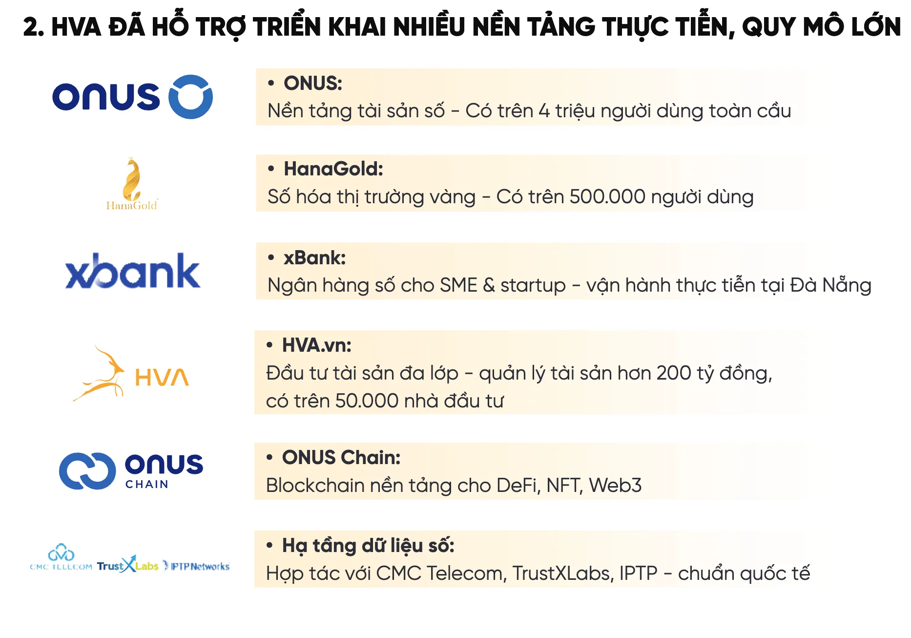 | HVA đã hỗ trợ triển khai nhiều nền tảng trong đó có ONUS. |