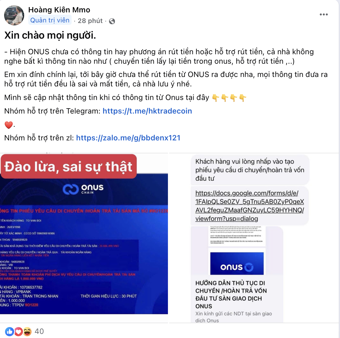 “Đội ngũ điều hành đang khẩn trương liên hệ với những người có thẩm quyền tại ONUS và sẽ cung cấp thêm thông tin cập nhật khi có thông tin mới”, thông cáo nêu.