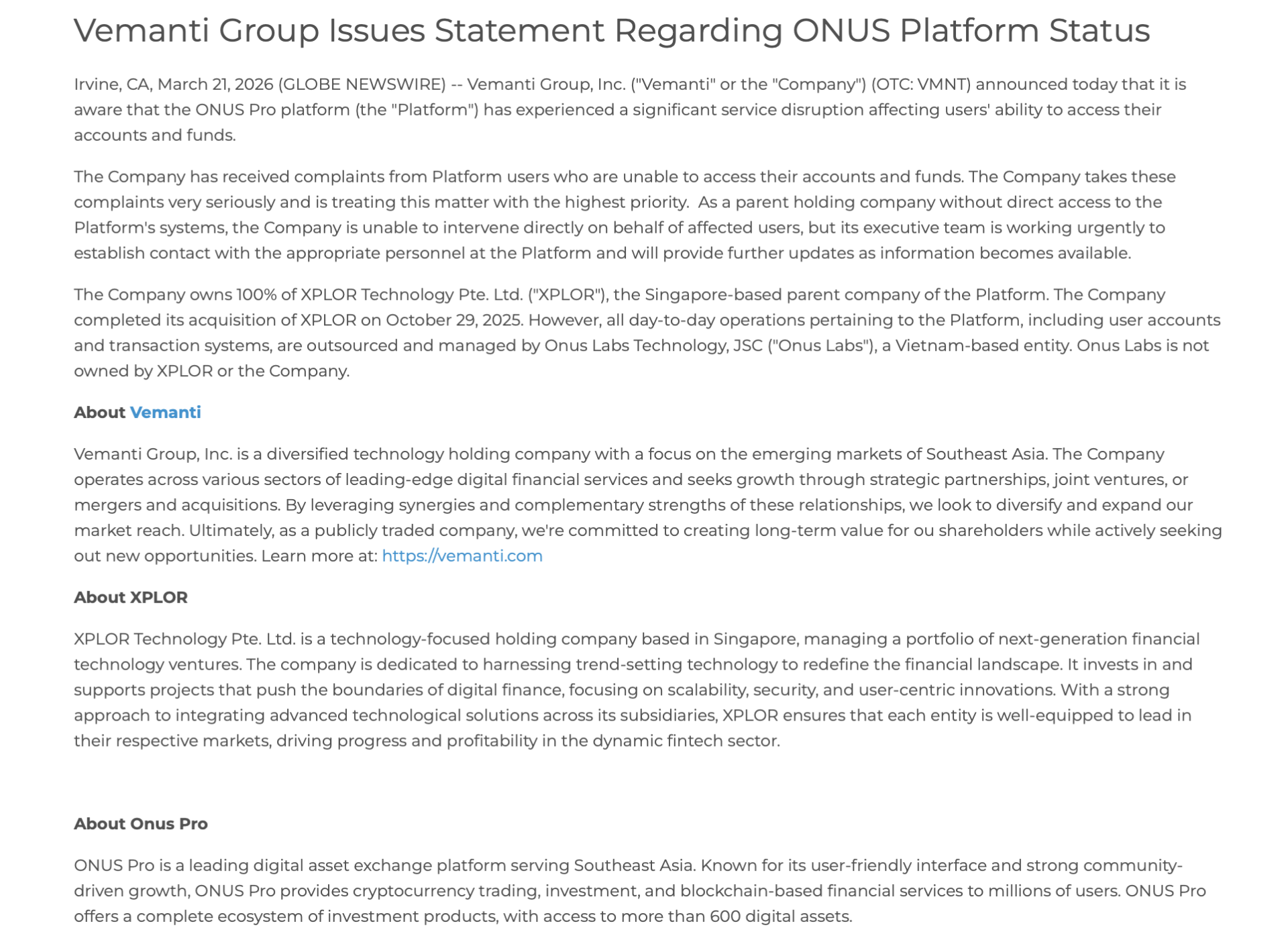 Công ty cho biết đã nhận được các khiếu nại từ người dùng không thể truy cập tài khoản và tiền của mình. Vemanti nhấn mạnh đang xử lý vấn đề này với mức độ ưu tiên cao nhất. Tuy nhiên, với vai trò là công ty mẹ nắm giữ cổ phần, Vemanti không có quyền truy cập trực tiếp vào hệ thống của ONUS nên không thể can thiệp ngay cho người dùng bị ảnh hưởng.