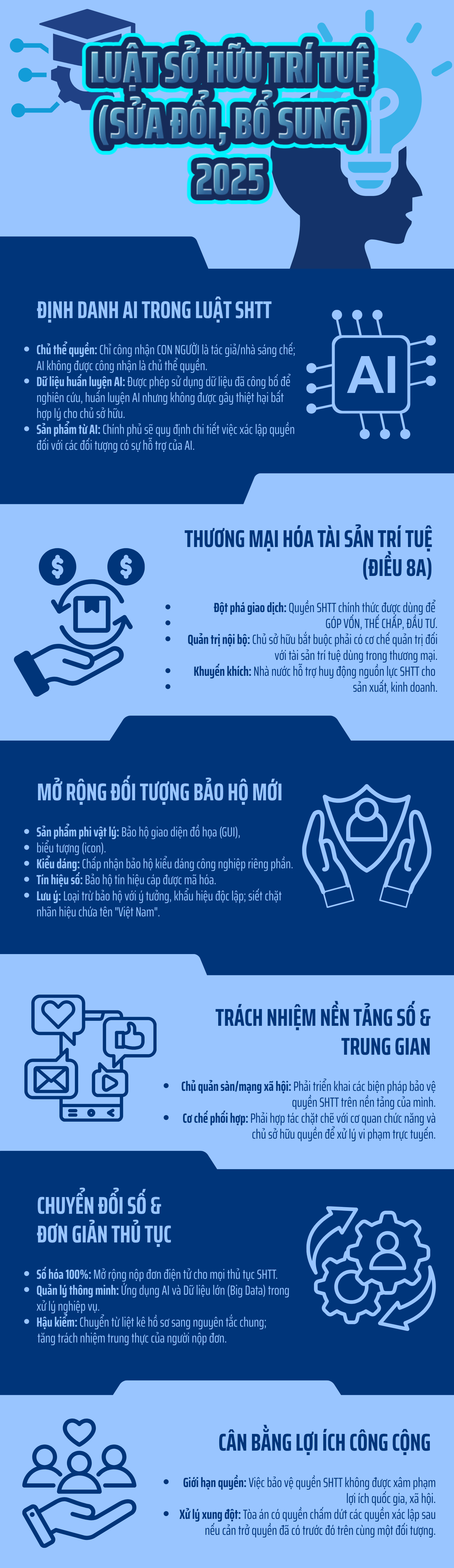 Luật cũng mở rộng phạm vi bảo hộ đối với nhiều đối tượng mới như giao diện đồ họa (GUI), biểu tượng (icon), tín hiệu cáp được mã hóa, kiểu dáng công nghiệp riêng phần; đồng thời làm rõ các đối tượng không được bảo hộ như ý tưởng, khẩu hiệu độc lập và siết chặt quy định đối với nhãn hiệu chứa tên “Việt Nam”.