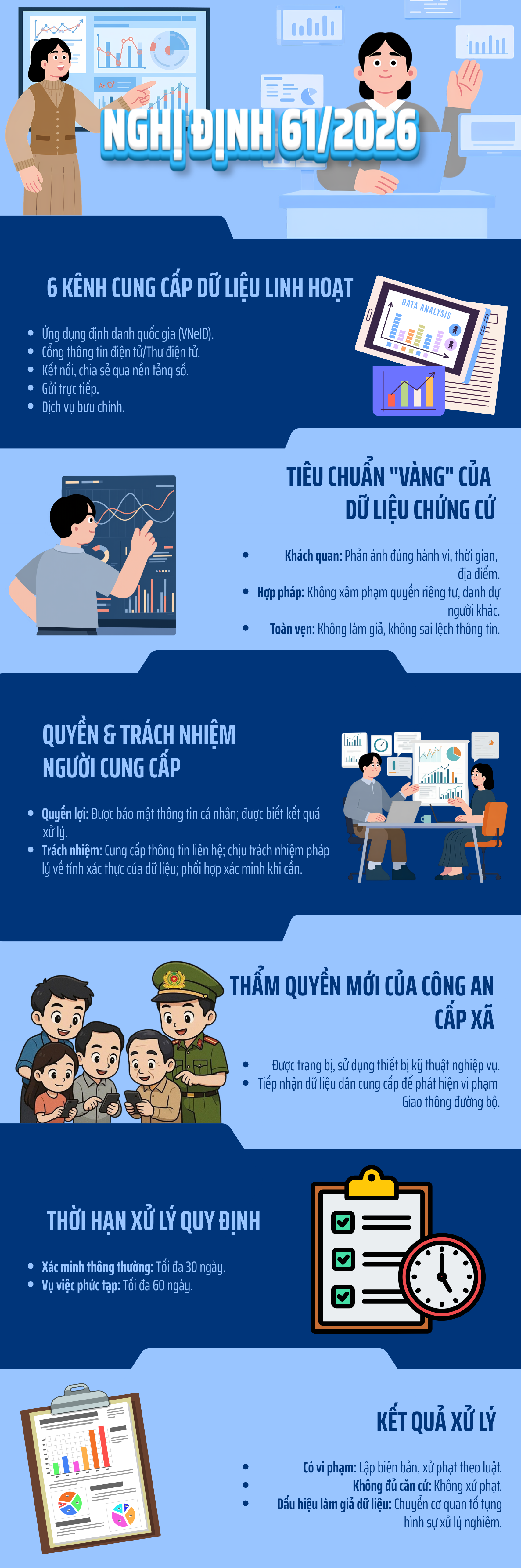 Cùng thời điểm, Nghị định 61/2026 cũng chính thức có hiệu lực, tạo hành lang pháp lý cho việc sử dụng dữ liệu do cá nhân, tổ chức cung cấp trong phát hiện và xử lý vi phạm hành chính.