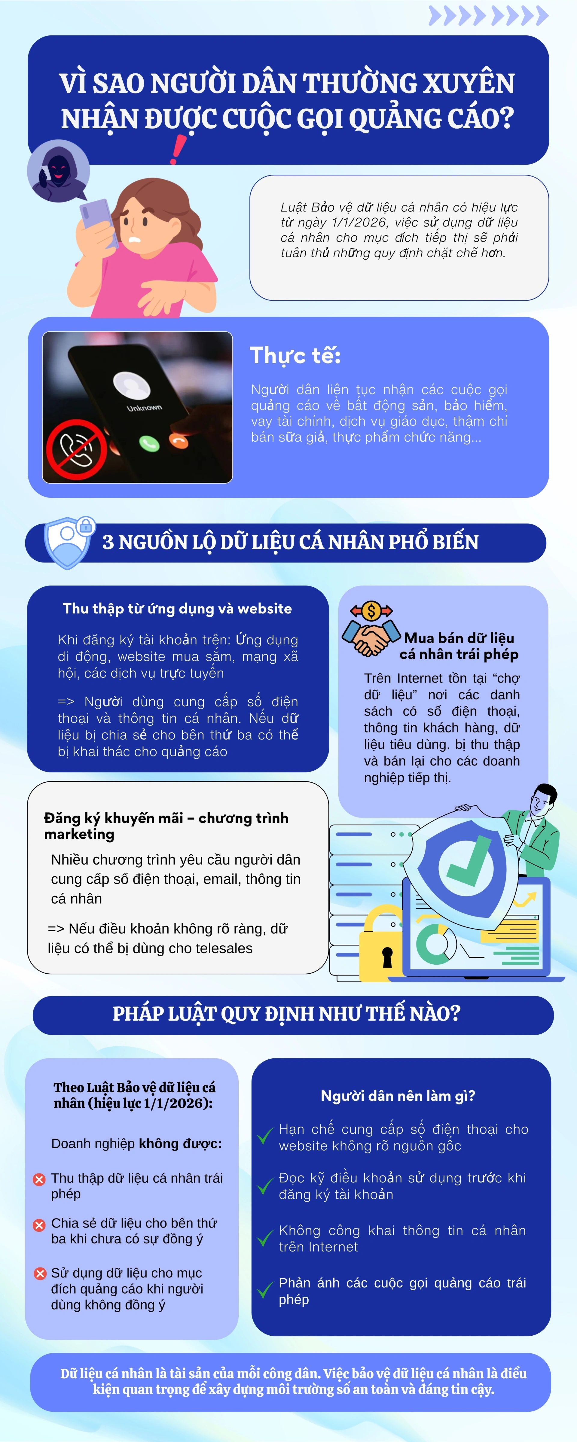 Ngoài ra, khi nhận được các cuộc gọi quảng cáo không mong muốn, người dân có thể từ chối tiếp nhận thông tin tiếp thị hoặc phản ánh tới cơ quan chức năng nếu nghi ngờ dữ liệu cá nhân của mình bị khai thác trái phép.