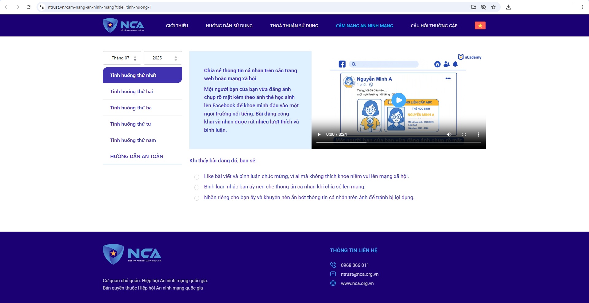 | Khi truy cập https://ntrust.vn/cam-nang-an-ninh-mang, người dùng có thể cập nhật các tình huống mới trong Cẩm nang an ninh mạng tháng 7 về các kỹ năng tự bảo vệ cho học sinh trên mạng. |