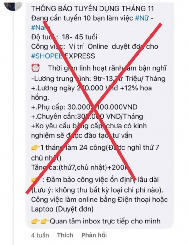 Các đối tượng này đưa ra yêu cầu tuyển dụng đơn giản, dễ dàng, không đòi hỏi kinh nghiệm, bằng cấp, không cần thử việc nhằm đánh trúng tâm lý của nhiều người đang nôn nóng tìm kiếm việc làm. Nhiều người mất tiền “oan” do tin vào những bài tuyển dụng việc làm xuất hiện tràn lan trên mạng xã hội.