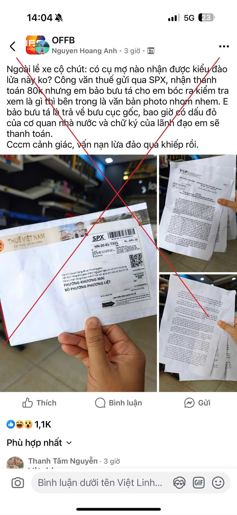 Theo đó, thời gian gần đây, trên mạng xã hội facebook đã xuất hiện các thông tin phản ánh về một hình thức lừa đảo mới. Cụ thể, các đối tượng mạo danh đã gửi các "công văn thuế" qua dịch vụ vận chuyển (như SPX) và yêu cầu người nhận phải thanh toán một khoản phí giao nhận khoảng 80.000 đồng.