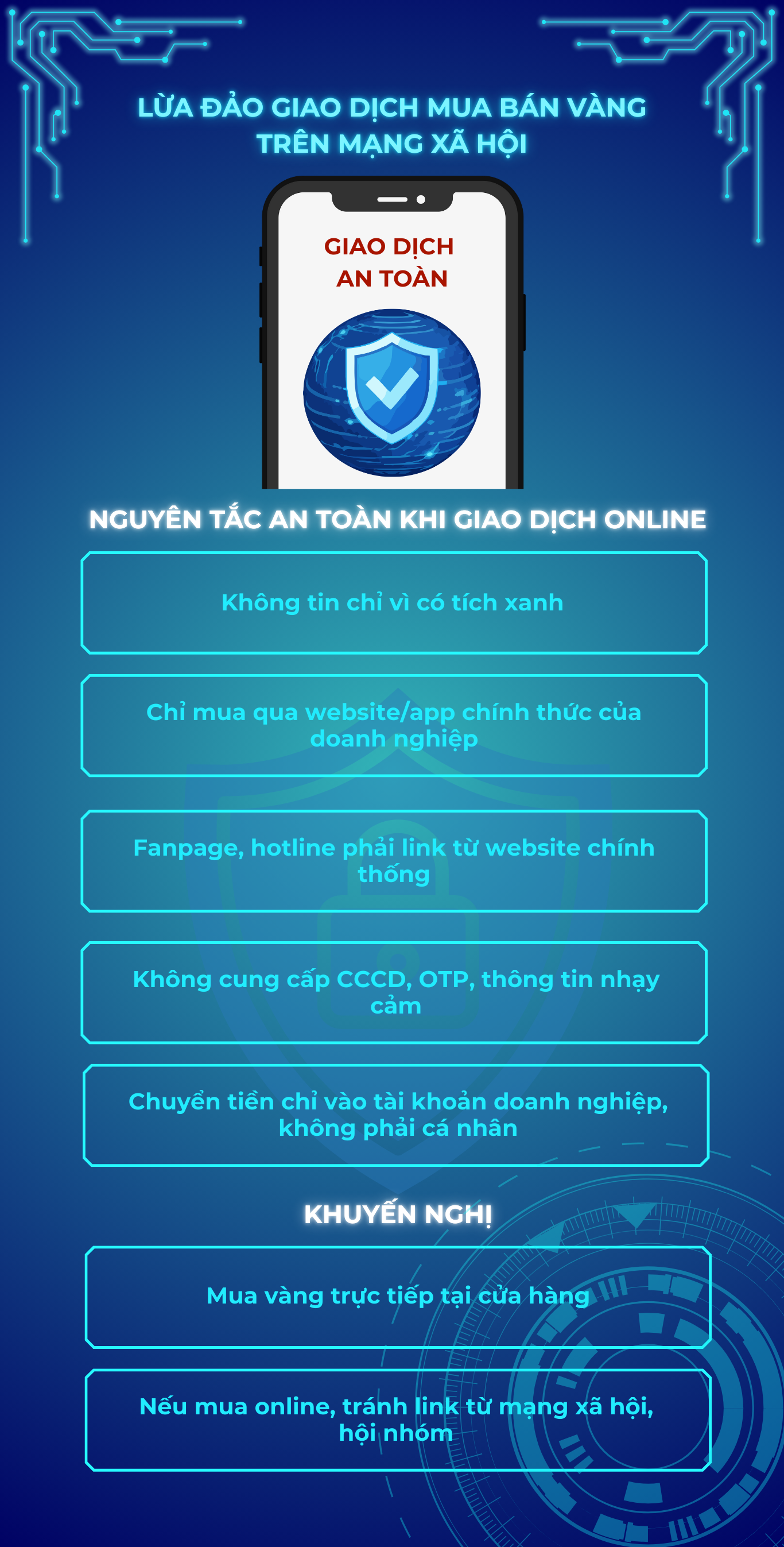 Từ thực tế các vụ lừa đảo, ông Nguyễn Minh Đức khuyến cáo người dân cần tuân thủ nghiêm ngặt các nguyên tắc an toàn khi giao dịch online, đặc biệt với các khoản tiền lớn như mua bán vàng. Trước hết, không nên chỉ dựa vào dấu tích xanh, mà cần truy cập trực tiếp website chính thống của các doanh nghiệp kinh doanh vàng uy tín như SJC, DOJI, PNJ, Bảo Tín… thay vì tìm kiếm đường link qua mạng xã hội hoặc hội nhóm.