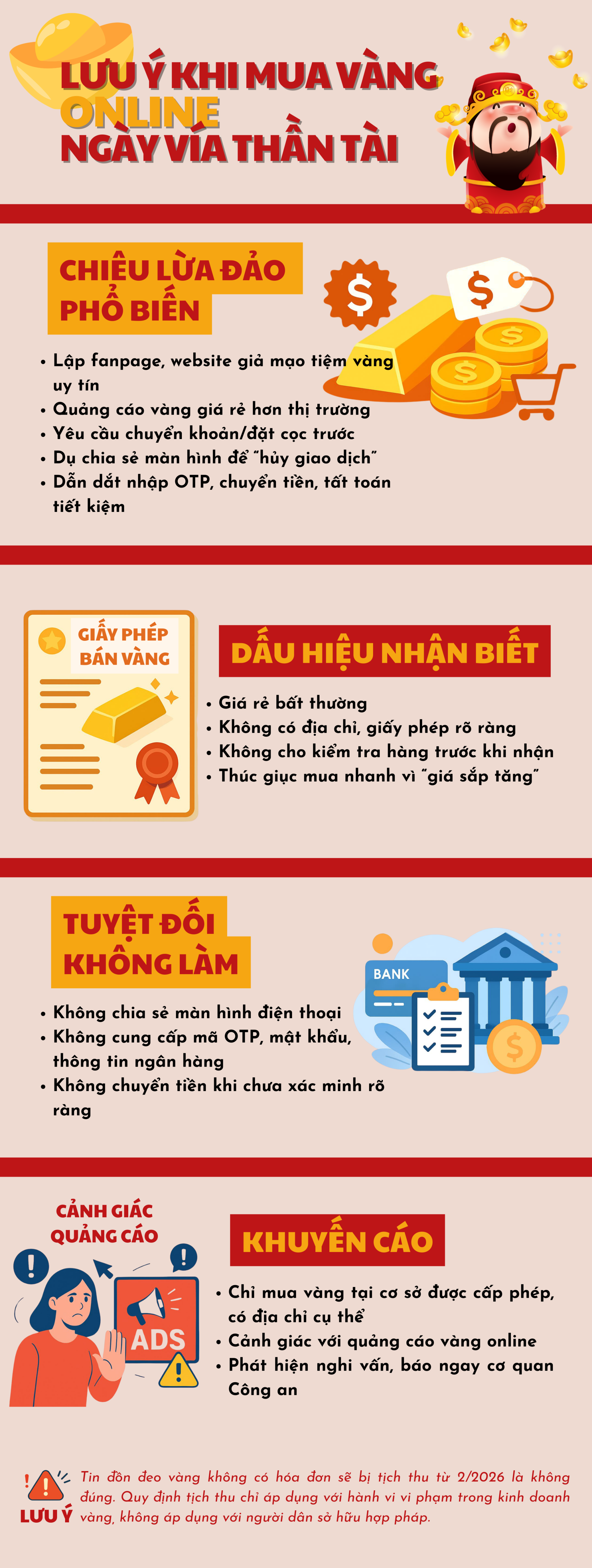 Cơ quan chức năng khuyến cáo người dân cần đặc biệt cảnh giác khi tham gia mua bán vàng, bạc trên không gian mạng; không mua bán qua các trang, tài khoản không rõ nguồn gốc; không tin vào quảng cáo giá rẻ bất thường; chỉ giao dịch tại cơ sở được cấp phép, có địa chỉ rõ ràng; khi phát hiện dấu hiệu nghi vấn cần kịp thời trình báo cơ quan Công an nơi gần nhất.