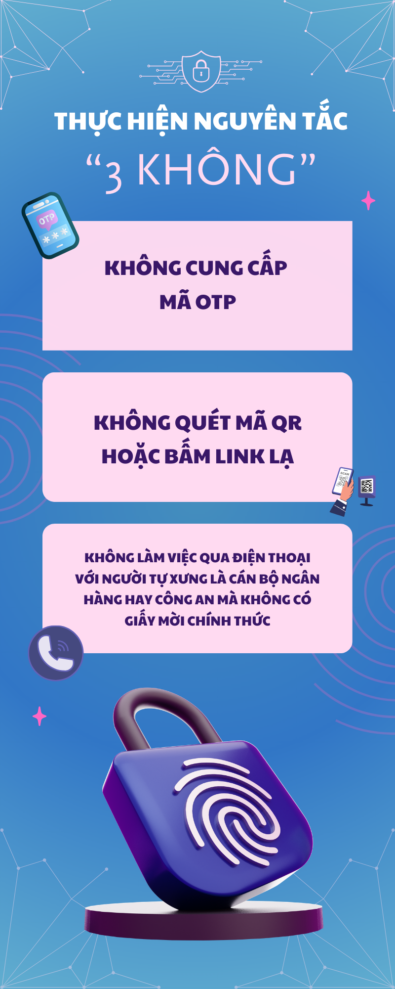 Lực lượng công an khuyến cáo người dân nâng cao tinh thần cảnh giác, thực hiện nghiêm nguyên tắc "3 Không": Không cung cấp mã OTP; không quét mã QR hoặc bấm link lạ; không làm việc qua điện thoại với người tự xưng là cán bộ ngân hàng hay Công an mà không có giấy mời chính thức. Khi gặp sự cố, hãy kịp thời phối hợp với cơ quan Công an gần nhất để được bảo vệ quyền lợi hợp pháp theo quy định.