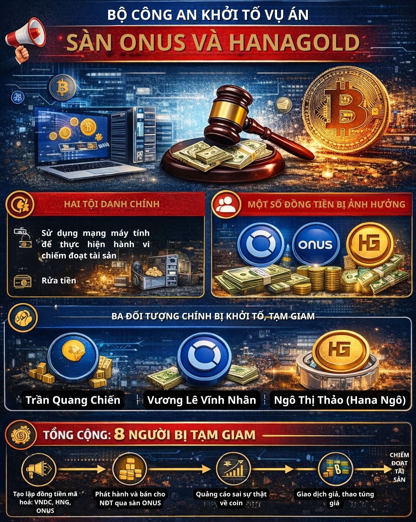 Theo kết quả điều tra ban đầu, từ năm 2018 đến nay, Vương Lê Vĩnh Nhân cùng Trần Quang Chiến, Ngô Thị Thảo và một số đối tượng liên quan đã tham gia xây dựng, phát hành và phân phối các đồng tiền mã hóa như VNDC, ONUS, HNG… thông qua hệ thống giao dịch.