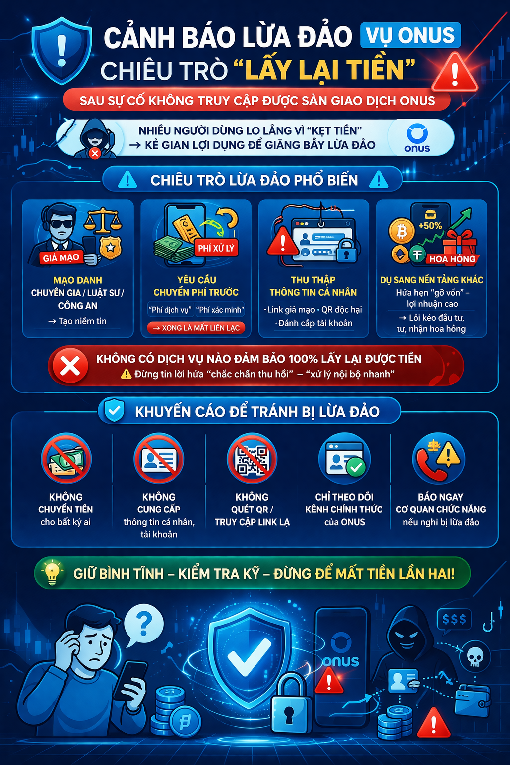 Trong bối cảnh thông tin về sự cố Onus chưa được làm rõ, người dùng được khuyến cáo giữ bình tĩnh, không chuyển tiền cho bất kỳ cá nhân hay tổ chức không rõ danh tính, không cung cấp thông tin nhạy cảm và chỉ theo dõi thông báo từ các kênh chính thức. Khi phát hiện dấu hiệu lừa đảo, cần nhanh chóng trình báo cơ quan chức năng để được hỗ trợ kịp thời.