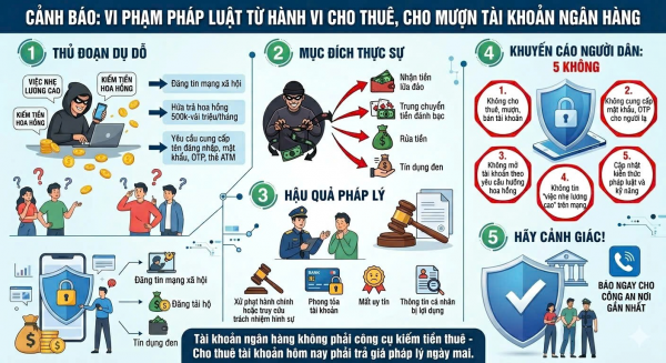 Để chủ động phòng ngừa, Công an khuyến cáo người dân: tuyệt đối không cho thuê, cho mượn, mua bán tài khoản ngân hàng dưới bất kỳ hình thức nào; không cung cấp thông tin đăng nhập, mật khẩu, mã OTP cho người khác; không mở tài khoản ngân hàng theo yêu cầu của người lạ để hưởng hoa hồng. Đồng thời, cần cảnh giác trước các lời mời gọi “việc nhẹ lương cao”, “kiếm tiền online nhanh chóng” trên mạng xã hội; thường xuyên cập nhật kiến thức pháp luật, nâng cao kỹ năng bảo vệ thông tin cá nhân.