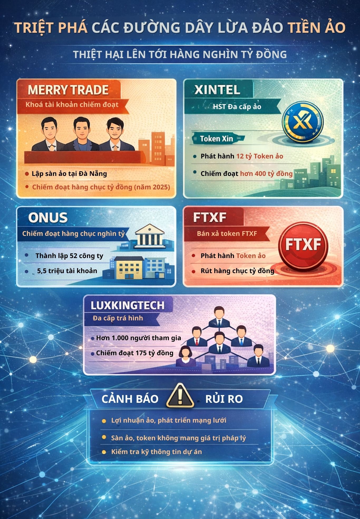 Từ đầu năm 2026 đến nay, lực lượng công an trên cả nước đã liên tiếp triệt phá nhiều đường dây lừa đảo tiền mã hóa với quy mô lớn, phương thức ngày càng tinh vi. Các đối tượng thường dựng lên các “dự án công nghệ”, sàn giao dịch hoặc hệ sinh thái tài chính số, kết hợp mô hình đa cấp và kỹ thuật thao túng để chiếm đoạt tài sản của nhà đầu tư, với tổng thiệt hại lên tới hàng nghìn, thậm chí hàng chục nghìn tỷ đồng.