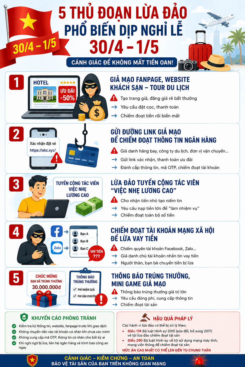 Càng cận kề kỳ nghỉ lễ 30/4 - 1/5, nhu cầu đi lại, du lịch, mua sắm và giao dịch trực tuyến của người dân tăng cao. Đây cũng là thời điểm các đối tượng lừa đảo trên không gian mạng gia tăng hoạt động, tận dụng tâm lý muốn săn ưu đãi, đặt dịch vụ nhanh, giá rẻ để giăng bẫy. Thực tế cho thấy, nhiều người đã bị chiếm đoạt tài sản chỉ sau vài phút thao tác, dù giao dịch ban đầu trông hoàn toàn hợp lệ