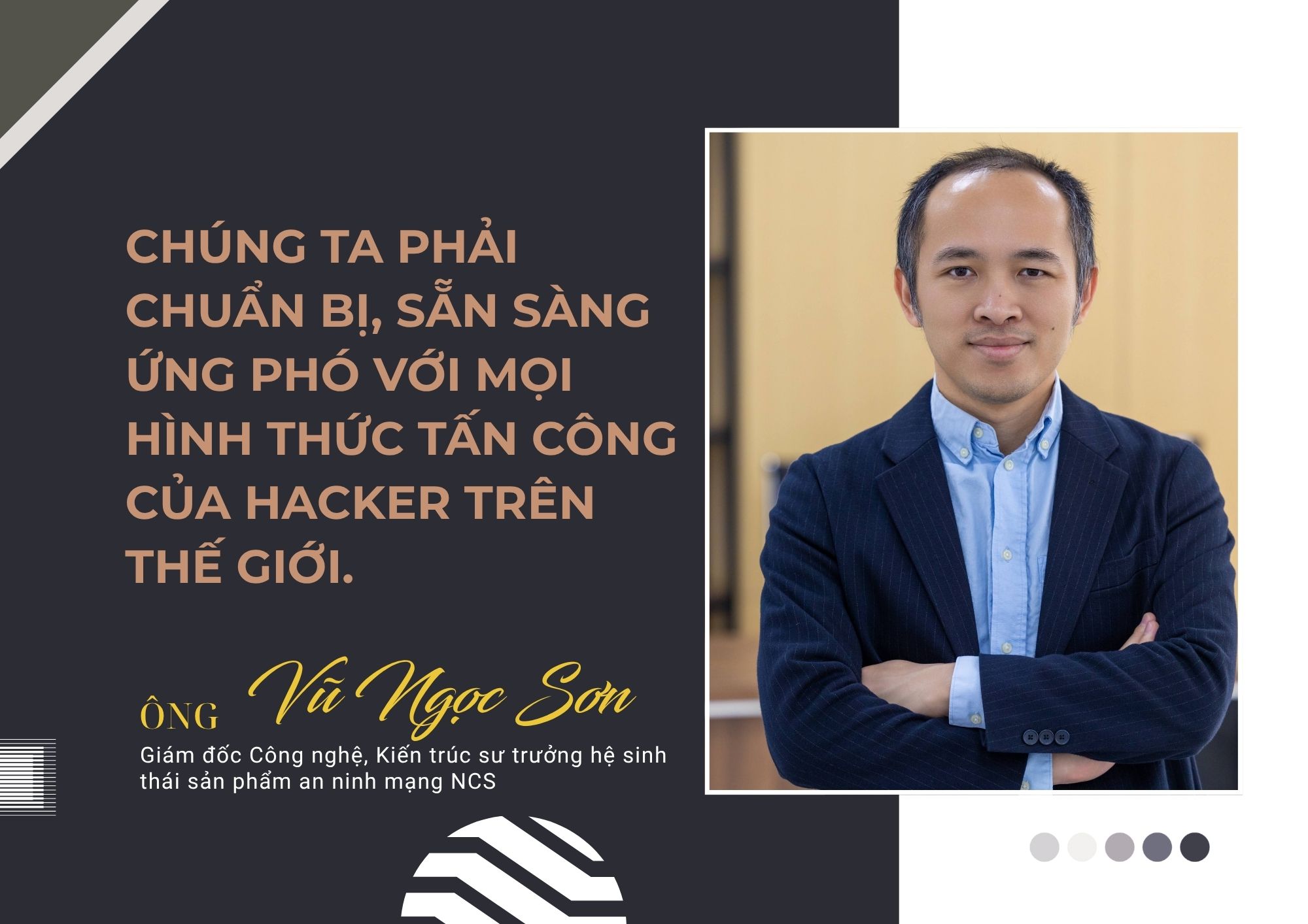 Không chỉ là Giám đốc Công nghệ, Kiến trúc sư trưởng hệ sinh thái sản phẩm an ninh mạng NCS, ông Vũ Ngọc Sơn còn là Trưởng Ban Nghiên cứu, tư vấn, phát triển công nghệ và Hợp tác quốc tế của Hiệp hội An ninh mạng quốc gia (NCA)?
