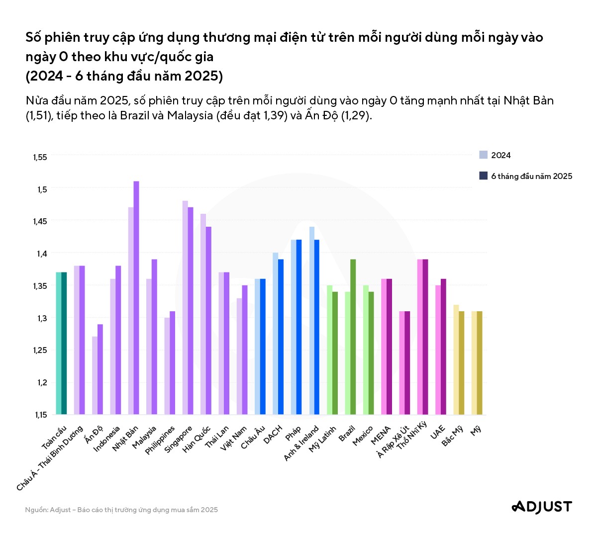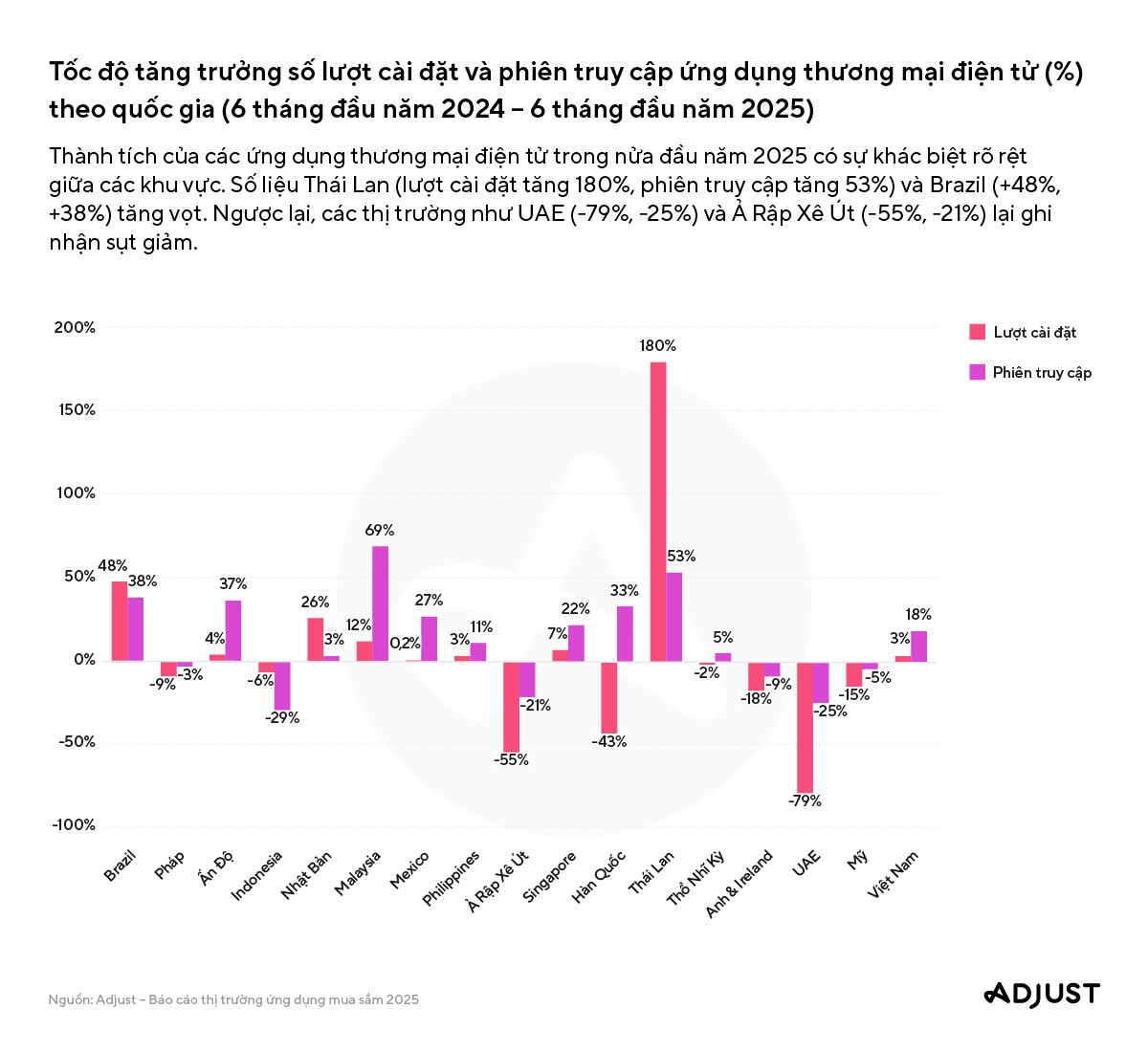 Báo cáo của Adjust chỉ ra những chuyển dịch đáng kể theo khu vực trong xu hướng tăng trưởng của thương mại điện tử trên nền tảng di động. Trong khi các thị trường trưởng thành như châu Âu, Bắc Mỹ và MENA ghi nhận mức tăng trưởng chậm lại do thị trường bão hòa và hành vi tiêu dùng thay đổi, khu vực châu Á - Thái Bình Dương (APAC) lại dẫn đầu với mức tăng 13% về lượt cài đặt và tăng 2% về số phiên truy cập so với cùng kỳ năm trước.