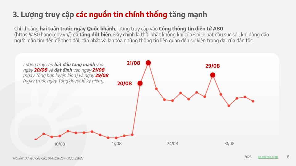 Khoảng hai tuần trước Quốc khánh, lượng truy cập Cổng thông tin điện tử A80 tăng đột biến, đạt đỉnh ngày 21/8 (Tổng hợp luyện lần 1) và 29/8 (Tổng duyệt). Song song với đó, Cổng thông tin điện tử Chính phủ cùng nhiều báo điện tử lớn cũng ghi nhận lượng truy cập cao, cho thấy nhu cầu mạnh mẽ của người dân trong việc tiếp cận thông tin chính thống, chính xác về đại lễ.