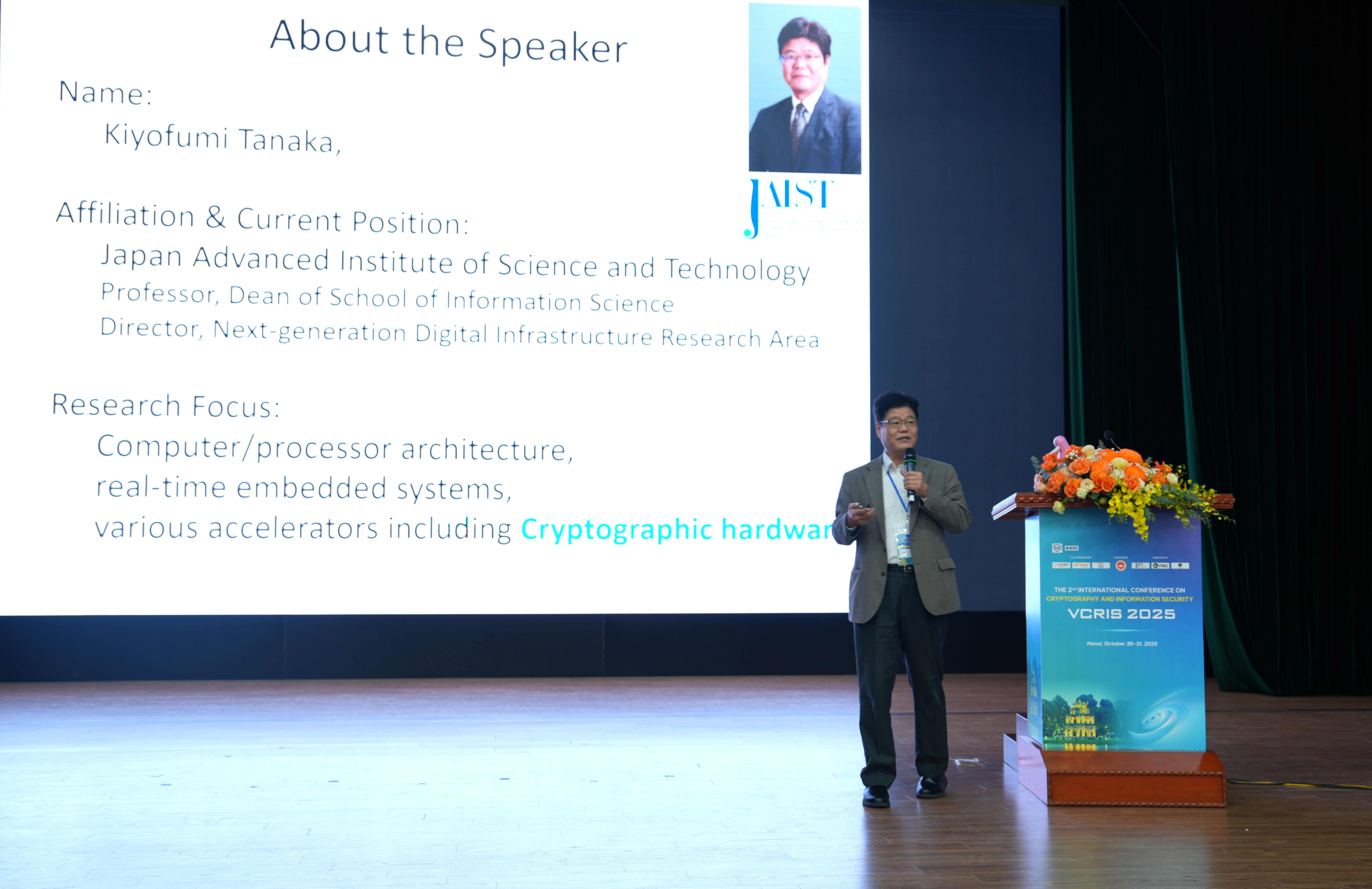 GS. Tanaka Kiyofumi (Viện Khoa học và Công nghệ tiên tiến Nhật Bản) trình bày tham luận “Challenges in High-Performance Cryptographic Hardware Design”, phân tích các giải pháp tối ưu thiết kế phần cứng mật mã hiệu suất cao trong hệ thống nhúng và IoT.