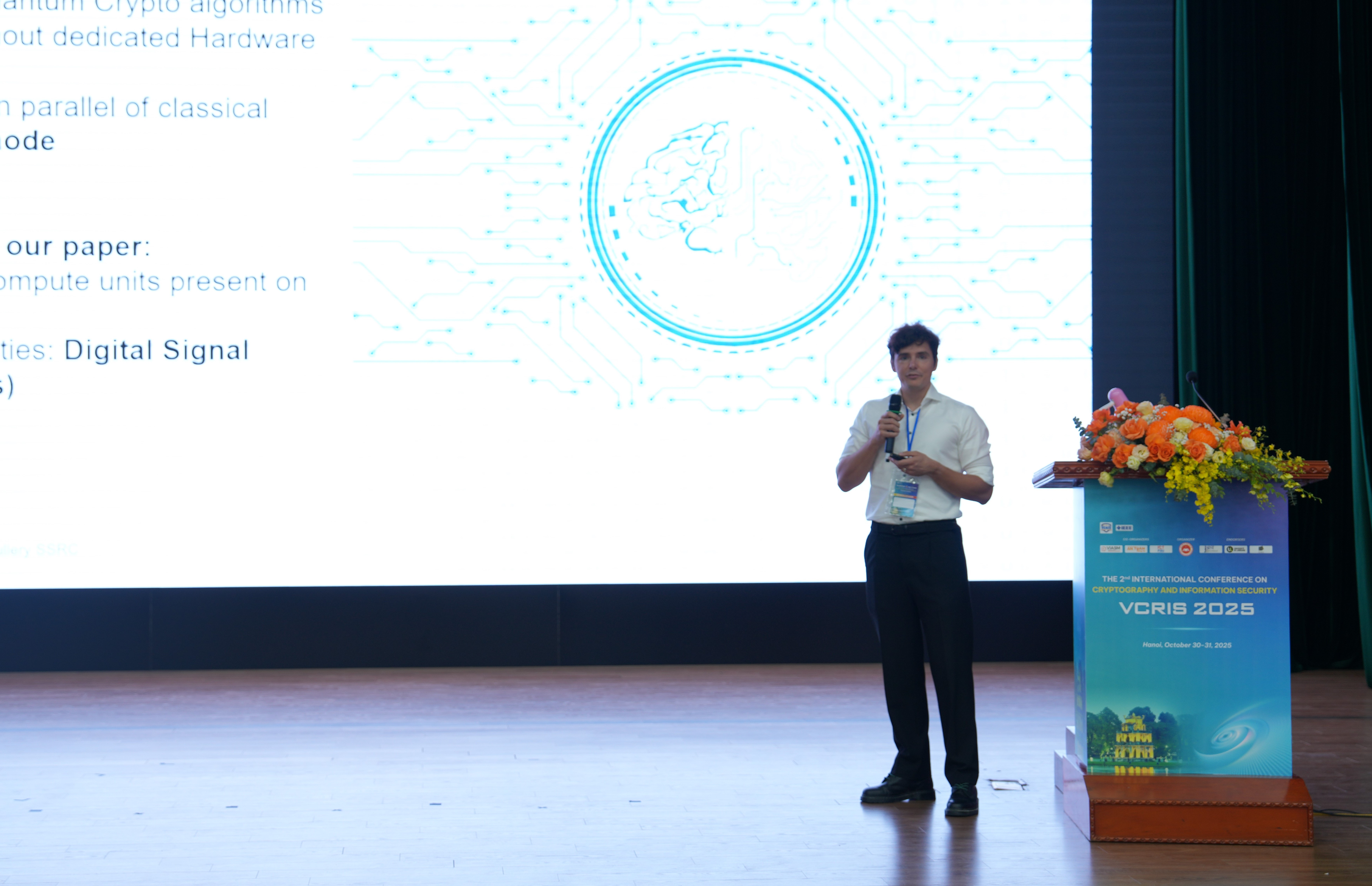 TS. Florian Caullery (Trung tâm Nghiên cứu Hệ thống An toàn, Các Tiểu vương quốc Ả Rập Thống nhất) trình bày báo cáo “One Chip, Many Engines: Accelerating and Securing Cryptographic Algorithms on Modern SoCs”, nêu các giải pháp tăng tốc và bảo mật thuật toán mật mã trên SoC hiện đại.