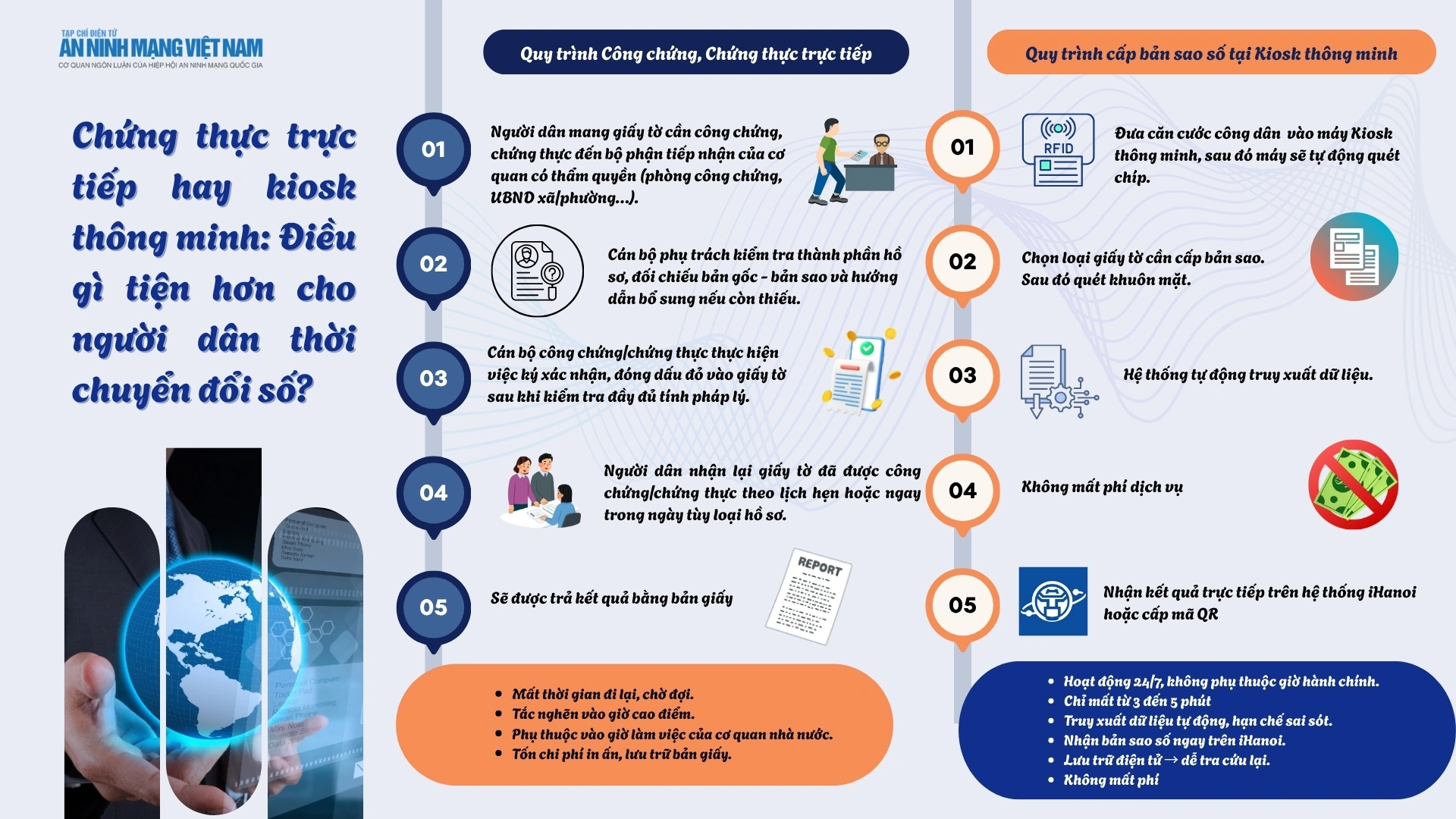 Trong bối cảnh đẩy mạnh chuyển đổi số quốc gia, việc cung cấp dịch vụ công theo hướng thuận tiện, minh bạch và giảm thời gian cho người dân đang trở thành yêu cầu cấp thiết. Một trong những thay đổi nổi bật thời gian gần đây là sự xuất hiện của các kiốt thông minh cấp bản sao số, đặt cạnh mô hình chứng thực trực tiếp truyền thống tại bộ phận một cửa. Với hình thức chứng thực trực tiếp, người dân cần mang theo giấy tờ bản gốc, đến cơ quan có thẩm quyền như phòng công chứng hoặc UBND xã/phường để nộp hồ sơ. Cán bộ sẽ kiểm tra, đối chiếu và thực hiện ký, đóng dấu. Kết quả được trả bằng bản giấy, phụ thuộc vào thời gian xử lý và giờ làm việc của cơ quan nhà nước. Hình thức này phù hợp với nhiều đối tượng, nhưng thường gây mất thời gian di chuyển, chờ đợi, đặc biệt vào các khung giờ cao điểm. Trong khi đó, kiosk thông minh mang đến cách tiếp cận hoàn toàn khác. Người dân chỉ cần đưa căn cước công dân gắn chip vào máy để xác thực, chọn loại giấy tờ cần cấp bản sao và thực hiện quét khuôn mặt. Hệ thống tự động truy xuất dữ liệu, tích hợp AI kiểm tra độ chính xác của giấy tờ cần cấp bản sao số. Kết quả bản sao số được trả ngay trên hệ thống iHanoi hoặc qua mã QR, hoạt động 24/7 và hoàn toàn không mất phí dịch vụ. So sánh hai mô hình cho thấy kiốt thông minh giúp tiết kiệm thời gian, giảm tải cho bộ phận một cửa và phù hợp với xu hướng số hóa dịch vụ công. Tuy nhiên, chứng thực trực tiếp vẫn giữ vai trò quan trọng với các hồ sơ phức tạp, đòi hỏi sự xác minh từ cán bộ chuyên môn.