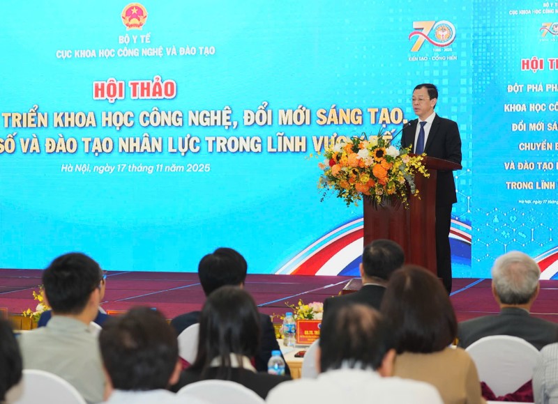 Thứ trưởng Bộ Y tế Nguyễn Tri Thức nhấn mạnh hội thảo là diễn đàn quan trọng để Bộ Y tế, các nhà khoa học, chuyên gia cùng nhìn lại kết quả thực hiện Nghị quyết 57 trong lĩnh vực y tế và định hướng triển khai Nghị quyết số 71-NQ/TW, ngày 22/8/2025 của Bộ Chính trị về đột phá phát triển giáo dục và đào tạo; Nghị quyết số 72-NQ/TW ngày 09/9/2025 của Bộ Chính trị về một số giải pháp đột phá, tăng cường bảo vệ, chăm sóc và nâng cao sức khỏe Nhân dân.