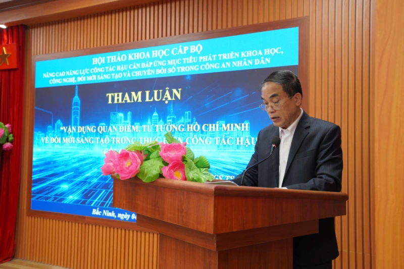 Đại tá Đỗ Đức Trịnh, Phó Giám đốc Công an tỉnh Bắc Ninh chia sẻ những kinh nghiệm trong mô hình đổi mới sáng tạo trong chuyển đổi số các mặt công tác hậu cần của Công an tỉnh Bắc Ninh. Lãnh đạo Công an tỉnh Bắc Ninh đề xuất Bộ Công an xây dựng mô hình hệ thống dữ liệu phục vụ công tác hậu cần thông minh; triển khai các phần mềm theo hướng quản lý dữ liệu tập trung; ban hành khung năng lực chuyển đổi số hậu cần CAND giai đoạn 2025-2030; tranh thủ các nguồn lực để phát triển hạ tầng công nghệ thông tin hiệu quả, bền vững và chú trọng công tác đảm bảo an toàn thông tin trong chuyển đổi số…