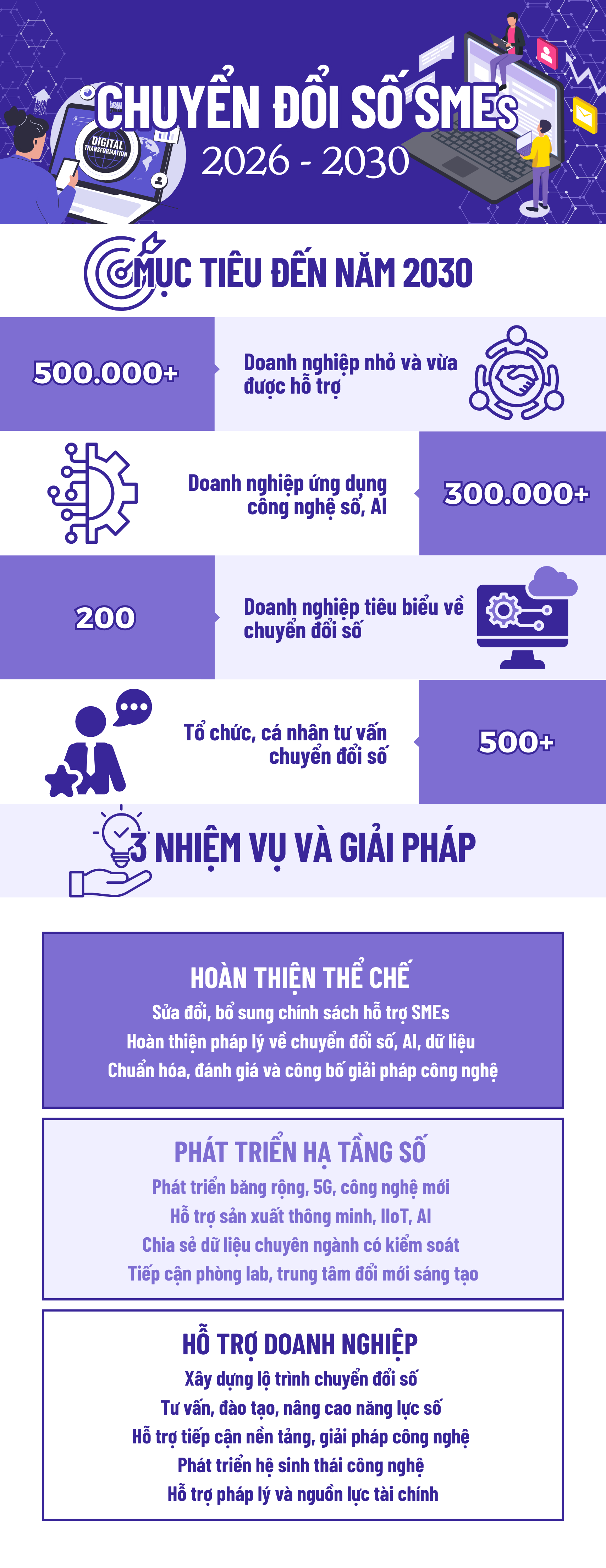 Đến năm 2030, phấn đấu ít nhất 500.000 doanh nghiệp nhỏ và vừa được hỗ trợ thông qua các hoạt động như đánh giá mức độ sẵn sàng, tư vấn, đào tạo và thử nghiệm giải pháp số. Trong đó, tối thiểu 300.000 doanh nghiệp sẽ trực tiếp ứng dụng các sản phẩm, nền tảng công nghệ số và trí tuệ nhân tạo vào hoạt động sản xuất, kinh doanh.