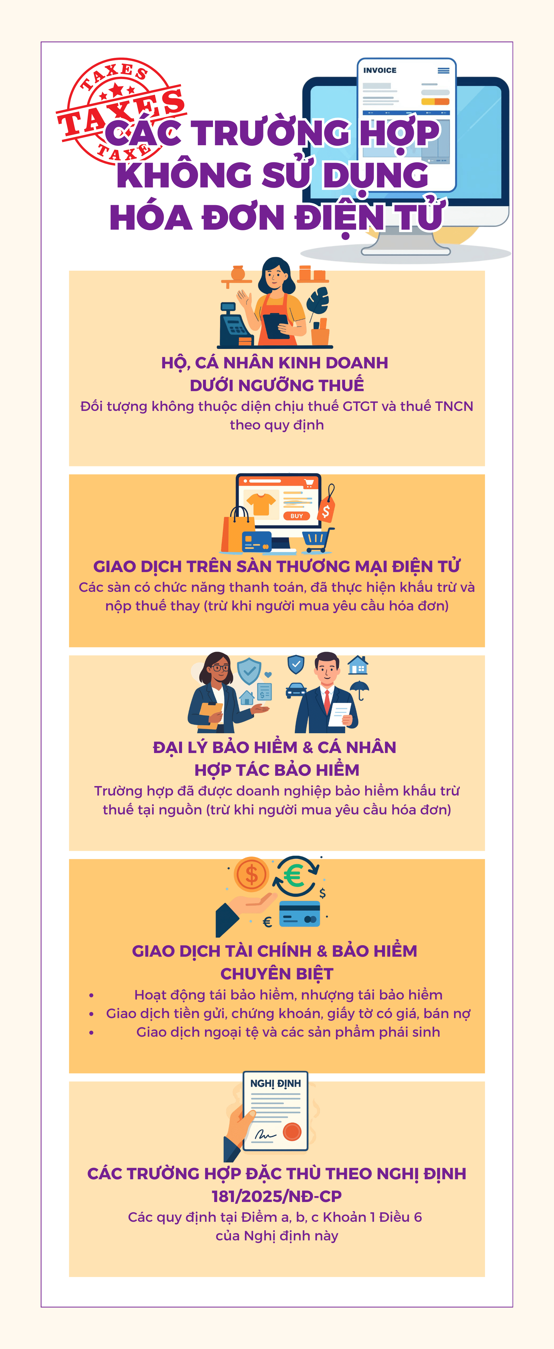 Tiếp theo là các giao dịch trên sàn thương mại điện tử có chức năng thanh toán, nơi chủ quản sàn đã thực hiện khấu trừ và nộp thuế thay theo từng giao dịch. Quy định này giúp tránh việc chồng chéo hóa đơn, trừ khi người mua có yêu cầu riêng biệt. Ngoài ra, các giao dịch tài chính chuyên sâu như chứng chỉ tiền gửi, phái sinh, bán nợ, ngoại tệ và các khoản thu hoa hồng tái bảo hiểm cũng được loại biên khỏi danh mục bắt buộc sử dụng HĐĐT do tính chất đặc thù của dòng vốn và chứng từ giao dịch.