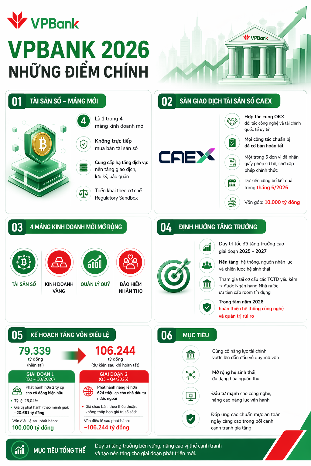 Năm 2026, VPBank cũng dự kiến tăng vốn điều lệ từ 79.339 tỷ đồng lên khoảng 106.244 tỷ đồng – mức tăng lớn nhất ngành ngân hàng hiện nay, qua đó có thể vươn lên dẫn đầu hệ thống về quy mô vốn.
