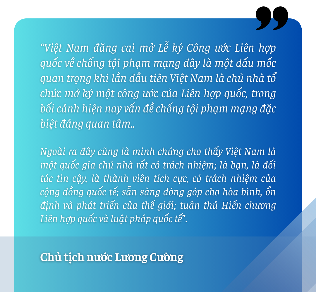 Đây là sự kiện mang ý nghĩa chiến lược và lịch sử đặc biệt. Lần đầu tiên Liên Hợp Quốc ban hành một công ước toàn cầu về phòng, chống tội phạm mạng - và Việt Nam, cụ thể là Hà Nội, được chọn làm địa điểm mở ký.