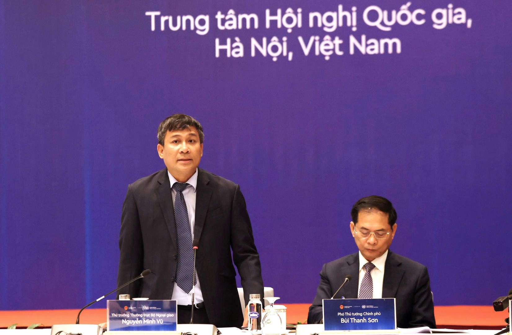 | Thứ trưởng Thường trực Bộ Ngoại giao Nguyễn Minh Vũ phát biểu tại cuộc họp. |
