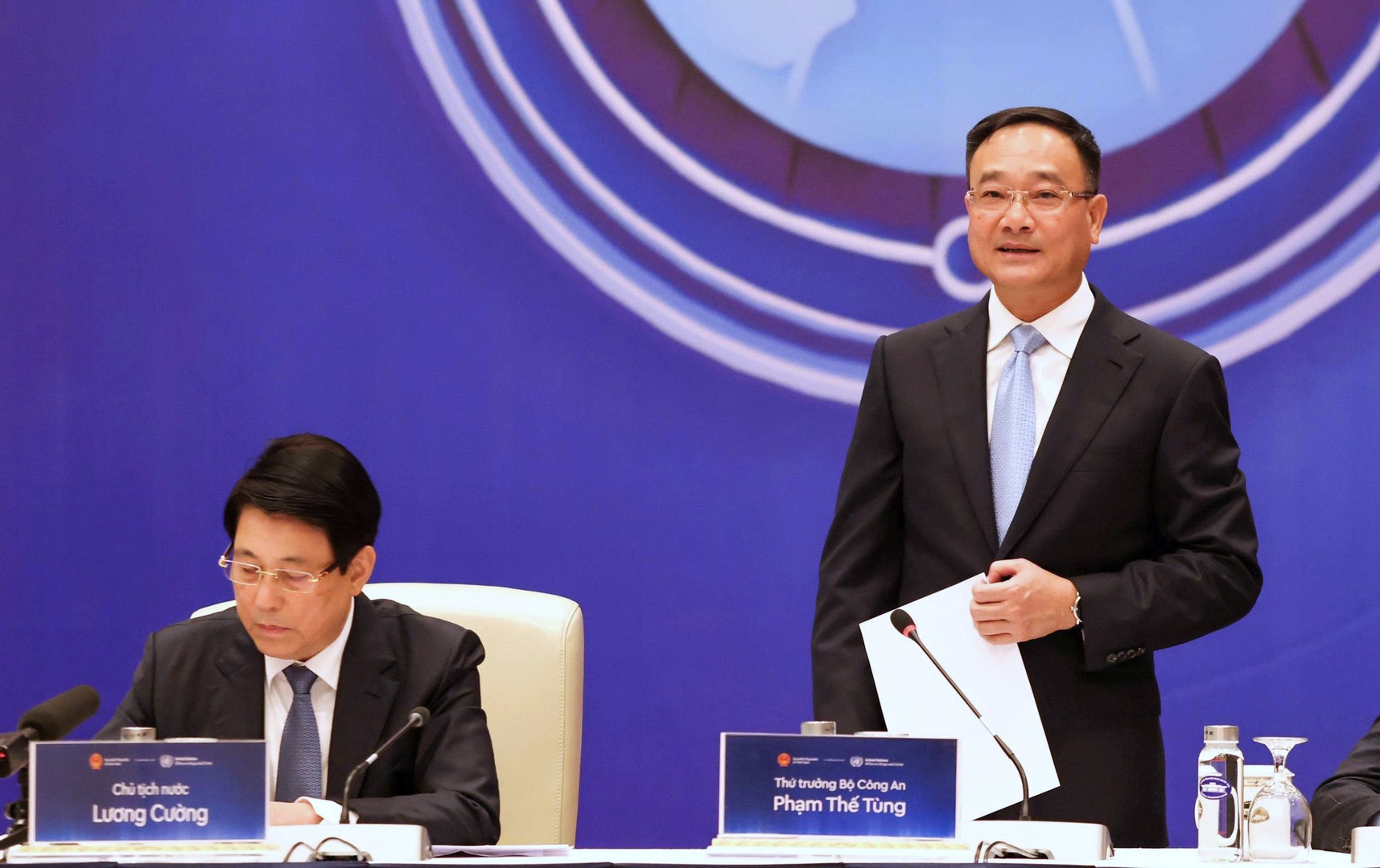 | Thứ trưởng Bộ Công an Phạm Thế Tùng phát biểu tại cuộc họp. |