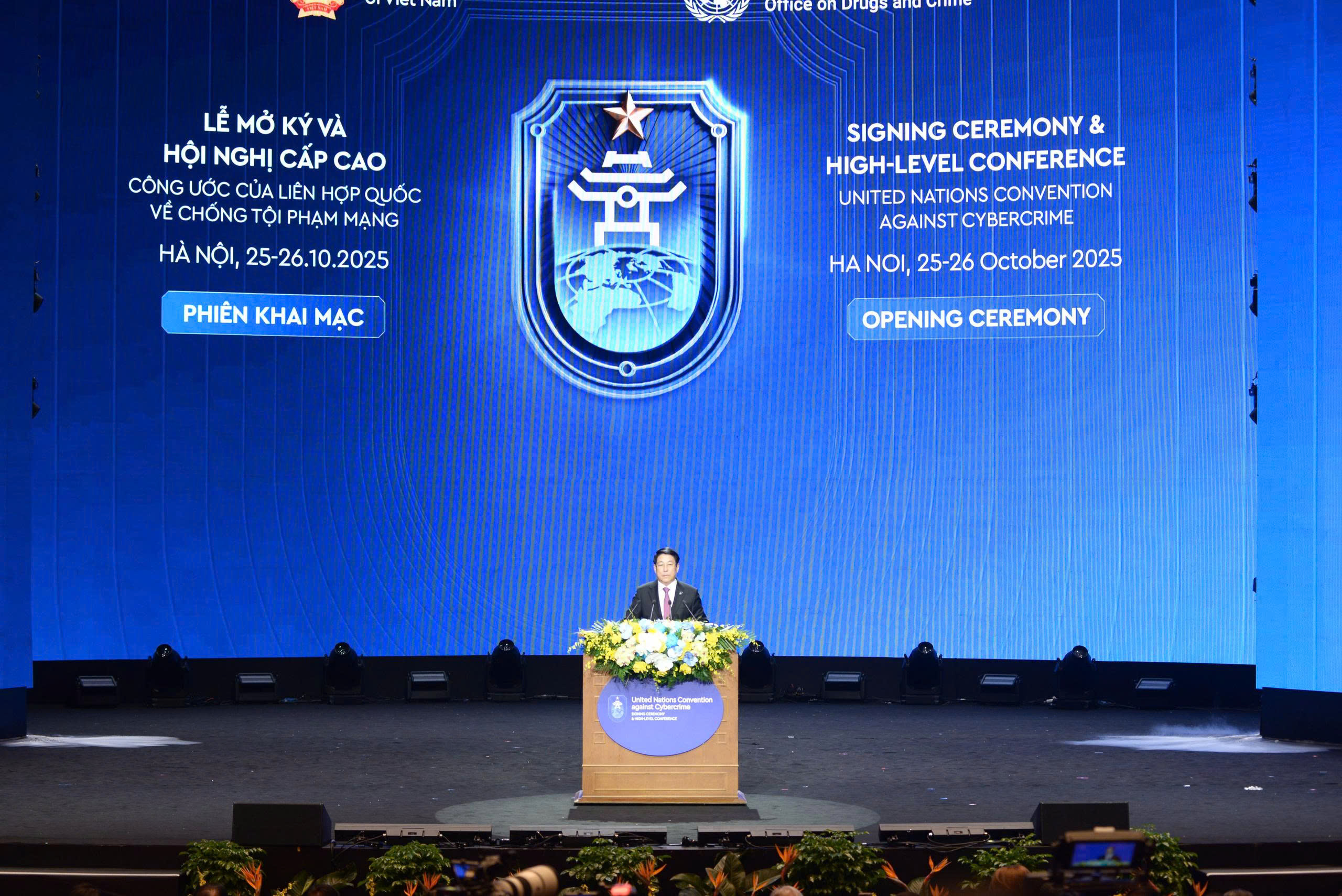 Phát biểu tại Lễ mở ký, thay mặt cho Nhà nước và Nhân dân Việt Nam, Chủ tịch nước Lương Cường nhiệt liệt chào mừng các đại biểu đến với Thủ đô Hà Nội - Thành phố vì Hòa bình, để tham dự Lễ mở ký Công ước Liên hợp quốc về chống tội phạm mạng - một sự kiện mang ý nghĩa lịch sử, khởi đầu cho kỷ nguyên hợp tác toàn cầu về không gian mạng.