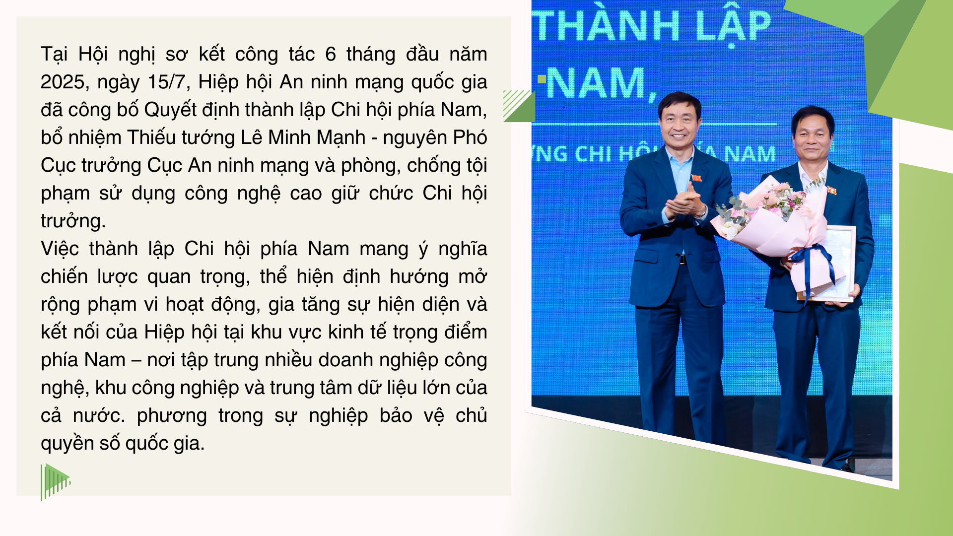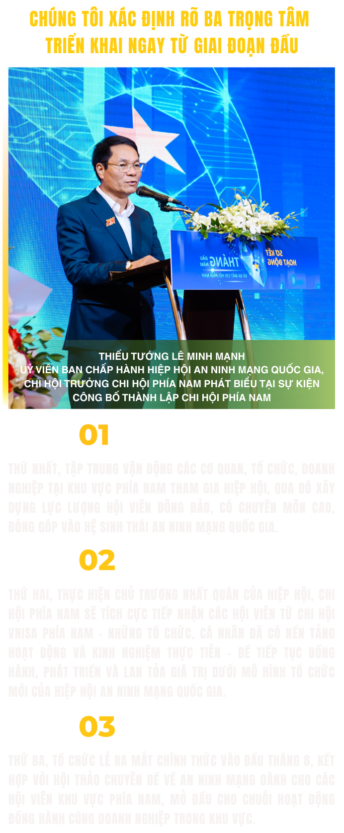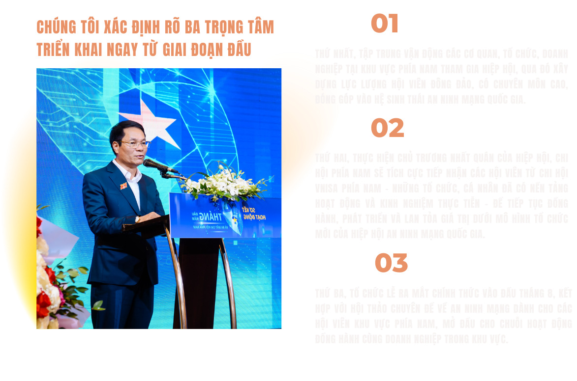 Thiếu tướng Lê Minh Mạnh: Việc thành lập Chi hội An ninh mạng quốc gia tại phía Nam là một bước đi chiến lược, thể hiện tầm nhìn dài hạn của lãnh đạo Hiệp hội – dưới sự chỉ đạo trực tiếp của đồng chí Đại tướng Lương Tam Quang, Ủy viên Bộ Chính trị, Bộ trưởng Bộ Công an, Chủ tịch Hiệp hội. Chi hội không chỉ giúp mở rộng phạm vi hoạt động của Hiệp hội mà còn tăng cường sự hiện diện thực chất tại khu vực phía Nam – trung tâm phát triển kinh tế - xã hội và công nghệ của cả nước. Tại đây quy tụ nhiều cơ quan quản lý nhà nước, doanh nghiệp công nghệ, tổ chức nghiên cứu khoa học, cơ sở đào tạo và các đối tượng bảo vệ trọng yếu của công tác an ninh mạng.