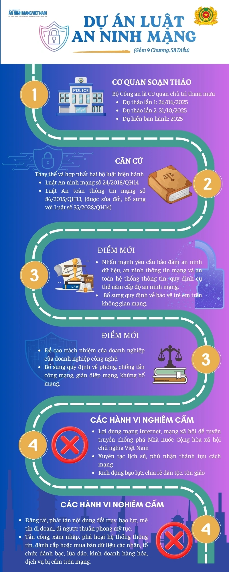 Dự thảo Luật An ninh mạng 2025 được xây dựng theo trình tự rút gọn, hợp nhất Luật An ninh mạng 2018 và Luật An toàn thông tin 2015, nhằm xoá bỏ chồng chéo, thống nhất đầu mối quản lý và chuẩn hóa các quy định kỹ thuật. Nhiều nội dung mới tập trung vào bảo đảm an ninh dữ liệu, kiểm soát chuyển dữ liệu xuyên biên giới, xây dựng tiêu chuẩn - quy chuẩn kỹ thuật, khuyến khích sử dụng sản phẩm an ninh mạng nội địa và phát triển thao trường, môi trường thử nghiệm.