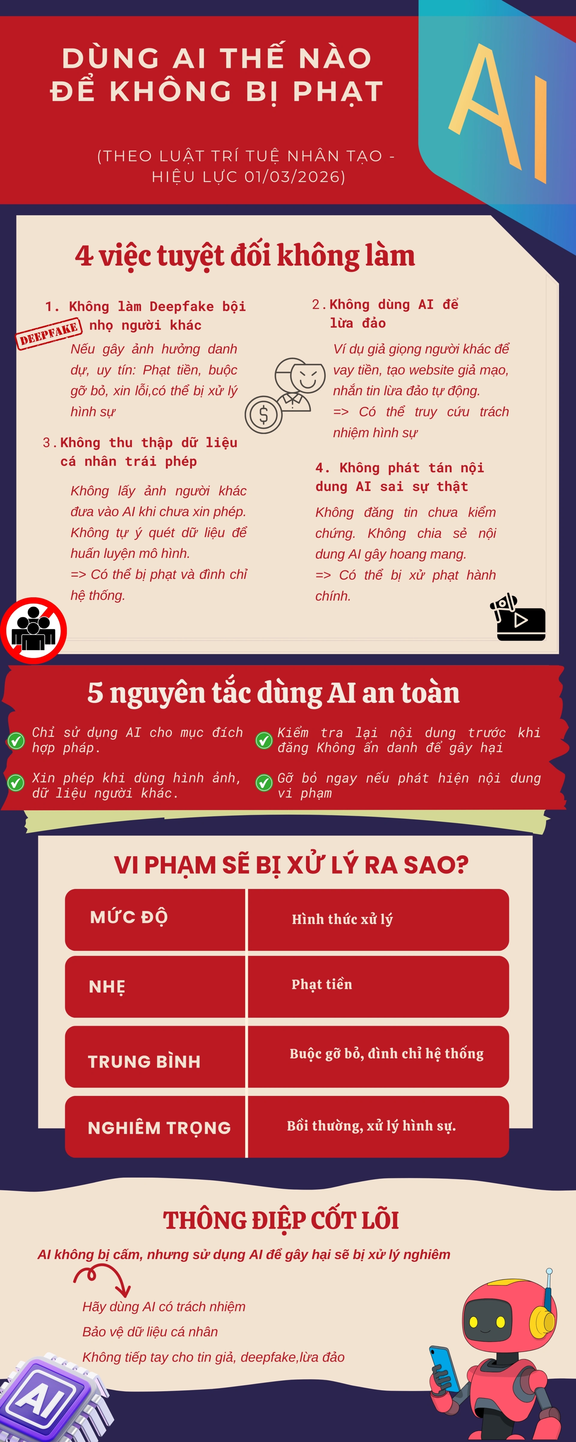 Từ ngày 01/3/2026, Luật Trí tuệ nhân tạo chính thức có hiệu lực, đặt ra khung pháp lý rõ ràng cho việc phát triển và sử dụng AI tại Việt Nam. Luật không “cấm AI”, nhưng xử lý nghiêm mọi hành vi lợi dụng công nghệ để lừa đảo, xâm phạm dữ liệu cá nhân, phát tán thông tin sai sự thật hay làm tổn hại danh dự người khác. Đây được xem là bước đi quan trọng nhằm bảo vệ người dân trong kỷ nguyên số, đồng thời tạo nền tảng cho đổi mới sáng tạo có trách nhiệm.
