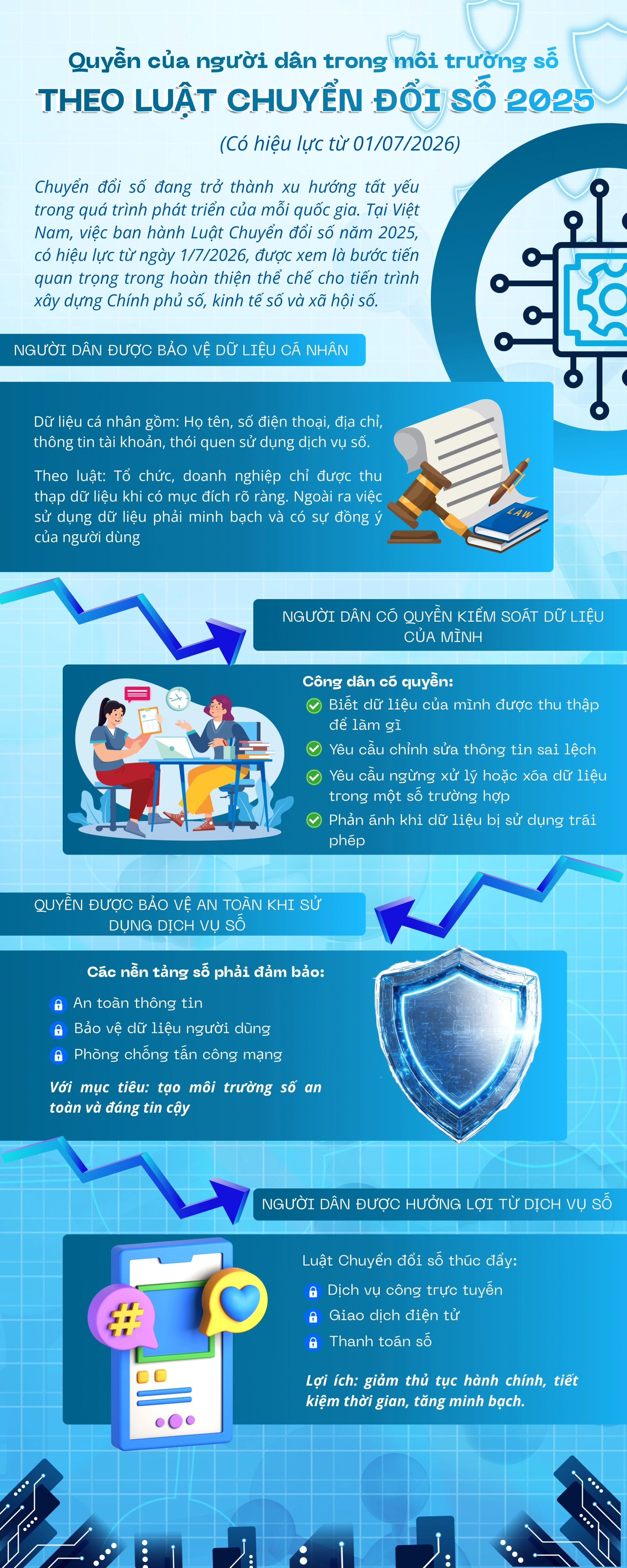Sự phát triển mạnh mẽ của Internet, nền tảng số và các dịch vụ trực tuyến đã làm thay đổi sâu sắc cách thức con người làm việc, giao tiếp và tiếp cận các dịch vụ công. Tuy nhiên, cùng với những tiện ích mà công nghệ mang lại, không gian mạng cũng đặt ra nhiều thách thức liên quan đến an toàn thông tin, bảo vệ dữ liệu cá nhân và nguy cơ lừa đảo trực tuyến. Chính vì vậy, một trong những mục tiêu quan trọng của Luật Chuyển đổi số là bảo đảm quyền của người dân khi tham gia môi trường số.