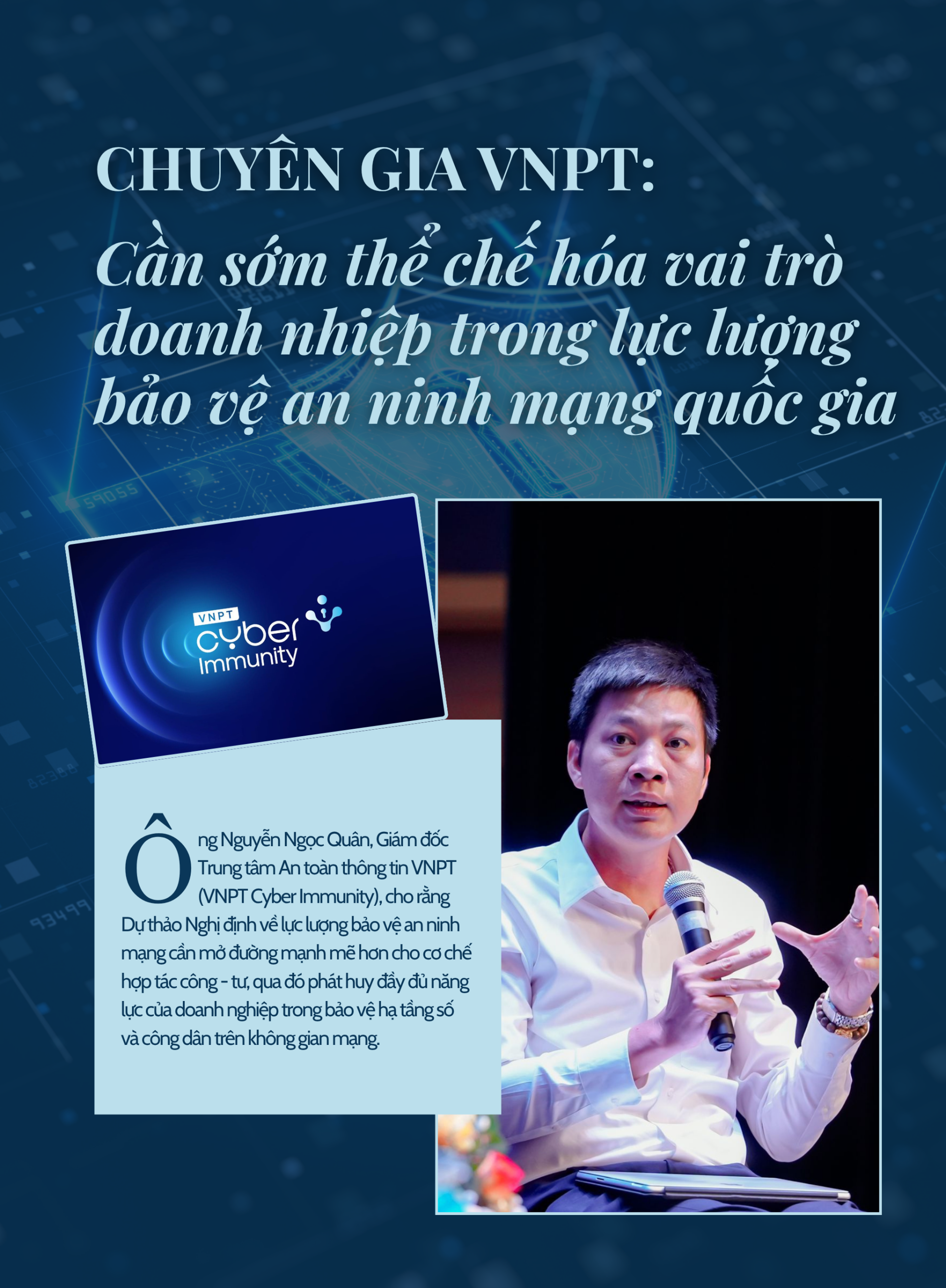 Ở góc độ doanh nghiệp hạ tầng, đại diện VNPT Cyber Immunity mong muốn Dự thảo Nghị định sẽ công nhận rõ ràng vai trò của các doanh nghiệp đang vận hành hạ tầng trọng yếu như VNPT, qua đó định danh họ là những đối tác kỹ thuật chủ lực trong hệ sinh thái bảo vệ an ninh mạng. Xa hơn, ông kỳ vọng Nghị định sẽ tạo lực đẩy cho công nghiệp an ninh mạng nội địa thông qua việc ưu tiên các sản phẩm “Made in Vietnam”, hỗ trợ hoạt động nghiên cứu - phát triển và mở ra các cơ chế thử nghiệm, sandbox cho công nghệ mới.