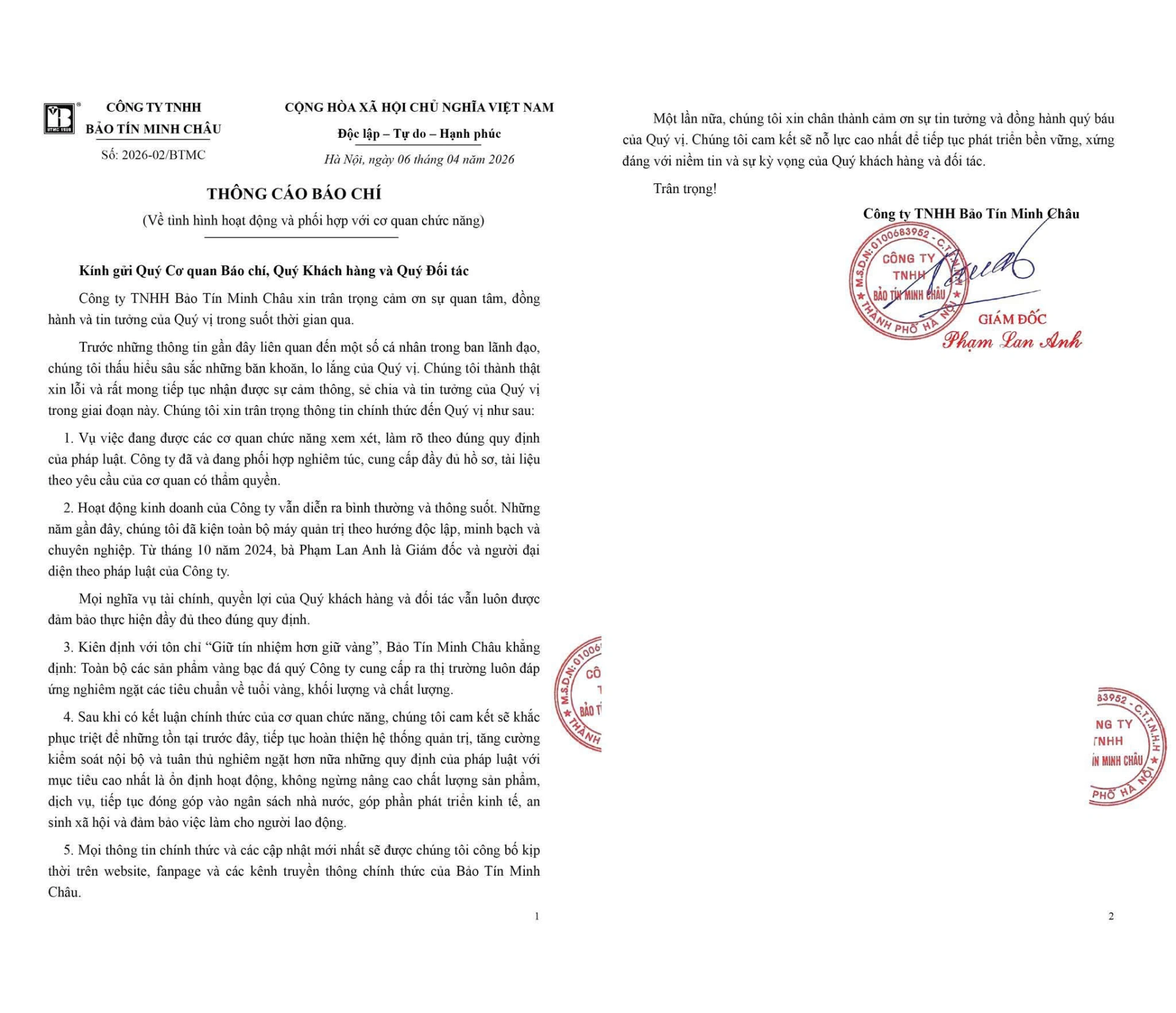 Bảo Tín Minh Châu khẳng định hoạt động kinh doanh hiện vẫn diễn ra “bình thường và thông suốt”. Doanh nghiệp cho biết trong thời gian gần đây đã kiện toàn bộ máy quản trị theo hướng độc lập, minh bạch và chuyên nghiệp. Theo thông tin được công bố, từ tháng 10/2024, bà Phạm Lan Anh là Giám đốc và người đại diện theo pháp luật của công ty.
