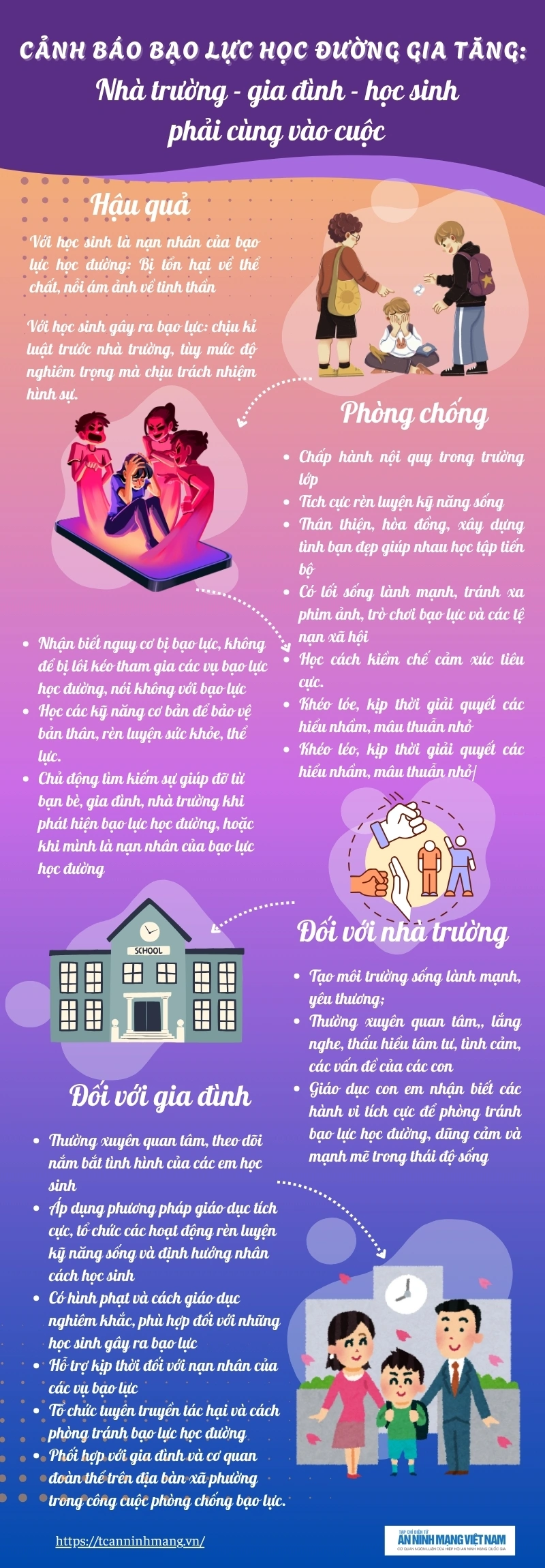 Về phía gia đình, phụ huynh được đề nghị thường xuyên theo dõi tâm lý, hành vi của con em, giáo dục kỹ năng tự bảo vệ, định hướng nhân cách và phối hợp chặt chẽ với giáo viên, nhà trường khi có dấu hiệu bất thường. Gia đình cũng đóng vai trò quan trọng trong việc tuyên truyền về tác hại của bạo lực học đường.
