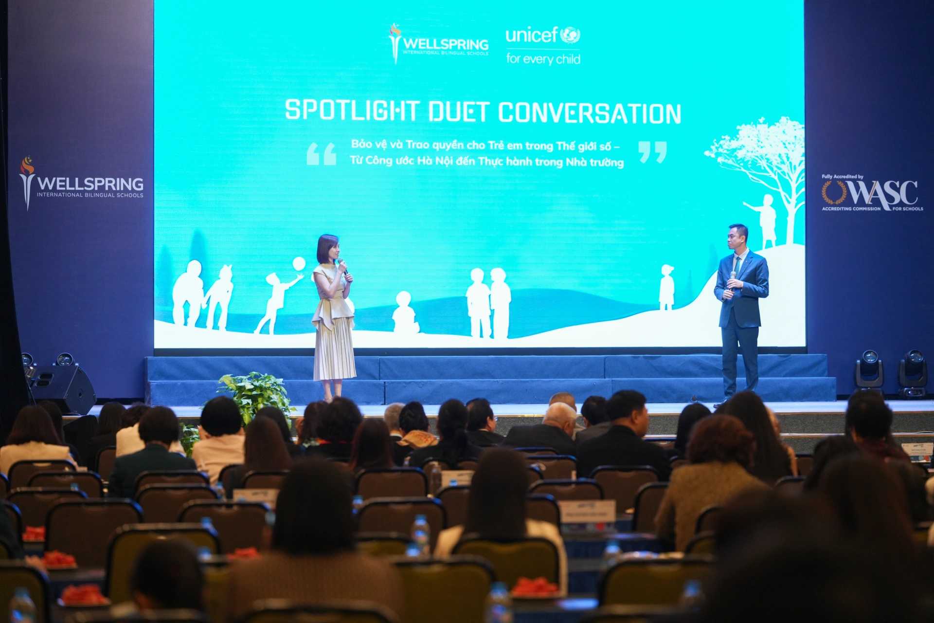 Chia sẻ tại sự kiện, Tiến sĩ Nguyễn Vĩnh Sơn - Phó Chủ tịch Hội đồng Giáo dục Hệ thống Wellspring, Tổng Hiệu trưởng Wellspring Hanoi cho rằng, trẻ em phải phát triển trong hai không gian song song: đời thực và đời sống số. “Không gian mạng chứa đựng cả cơ hội lẫn thách thức. Điều quan trọng là trẻ có được trang bị kỹ năng, được hướng dẫn đúng cách và được kết nối với những hệ thống hỗ trợ đủ mạnh”, Tiến sĩ Nguyễn Vĩnh Sơn chia sẻ.