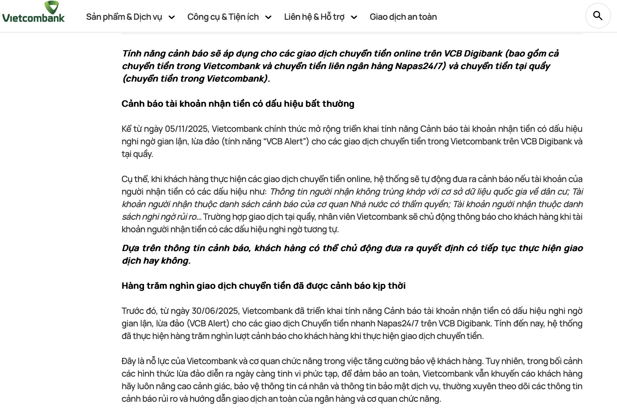 Tho Vietcombank, trước đó, từ ngày 30/06/2025, ngân hàng đã triển khai tính năng Cảnh báo tài khoản nhận tiền có dấu hiệu nghi ngờ gian lận, lừa đảo (VCB Alert) cho các giao dịch Chuyển tiền nhanh Napas24/7 trên VCB Digibank. Tính đến nay, hệ thống đã thực hiện hàng trăm nghìn lượt cảnh báo cho khách hàng khi thực hiện giao dịch chuyển tiền.