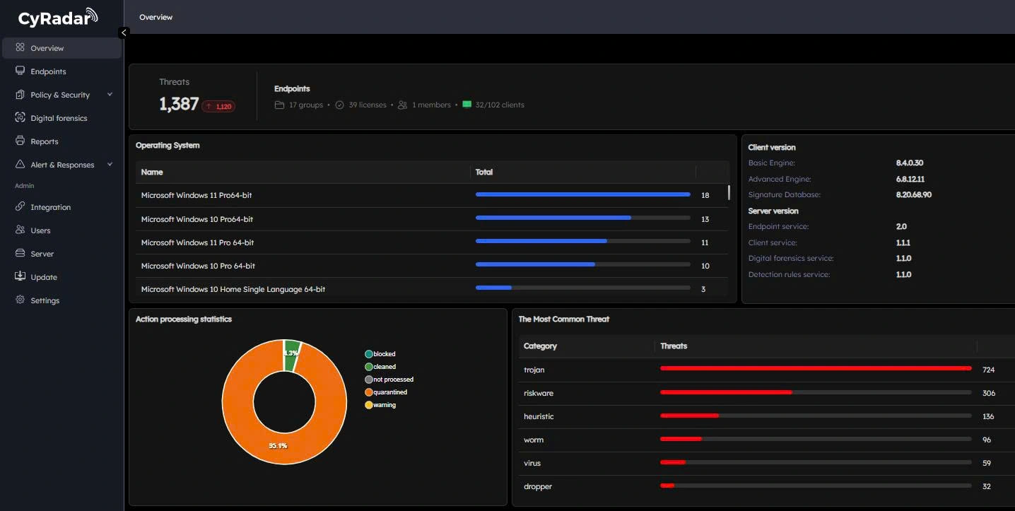 Bảng điều khiển quản trị CyRadar EDR với thống kê hệ điều hành, số lượng mối đe dọa, tình trạng xử lý và nhóm mối nguy phổ biến, hỗ trợ quản lý tập trung cho doanh nghiệp. |