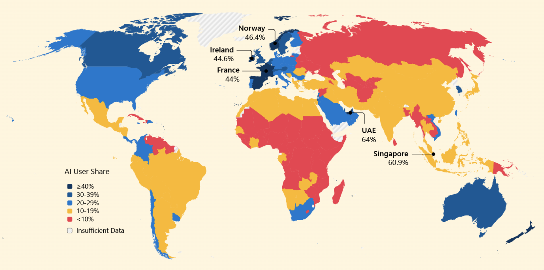 | Biểu đồ ứng dụng AI của các quốc gia trên thế giới năm 2025 (Nguồn: Microsoft). |
