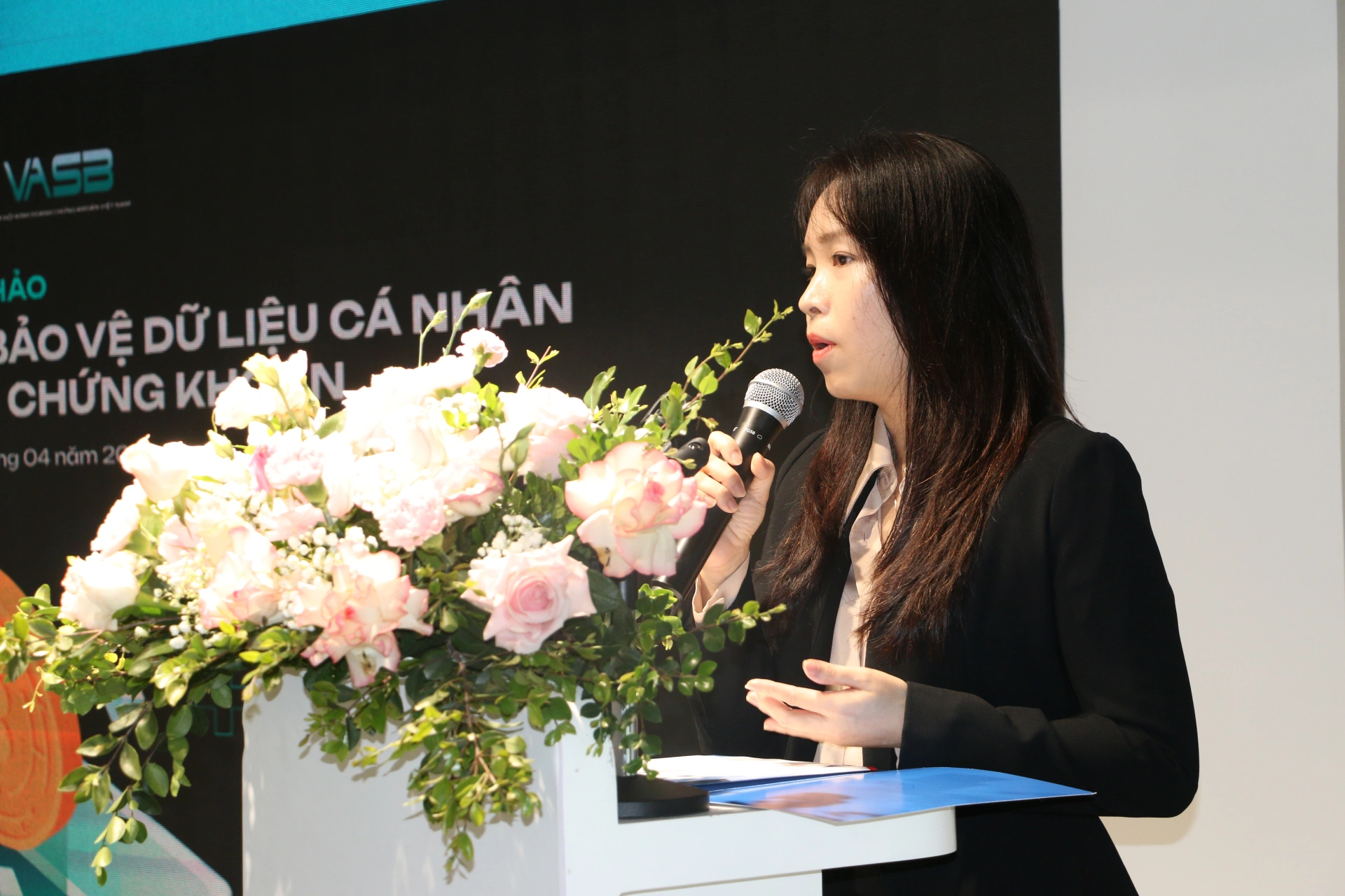 Tại hội thảo, bà Hoàng Hải Anh - Phó Chủ tịch kiêm Tổng Thư ký VASB cho biết trong bối cảnh chuyển đổi số, dữ liệu cá nhân đã trở thành tài sản có giá trị lớn đối với doanh nghiệp, đặc biệt trong lĩnh vực chứng khoán nơi lưu trữ xử lý khối lượng lớn thông tin tài chính của nhà đầu tư.
